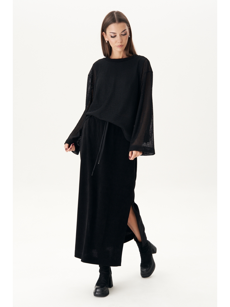 Юбка макси, прямая на притачном эластичном поясе с люверсами и отделочным шнуром в кулисе, наклонными боковыми карманами и разрезом сбоку, из текстильного трикотажного полотна эффекта "вельвет".