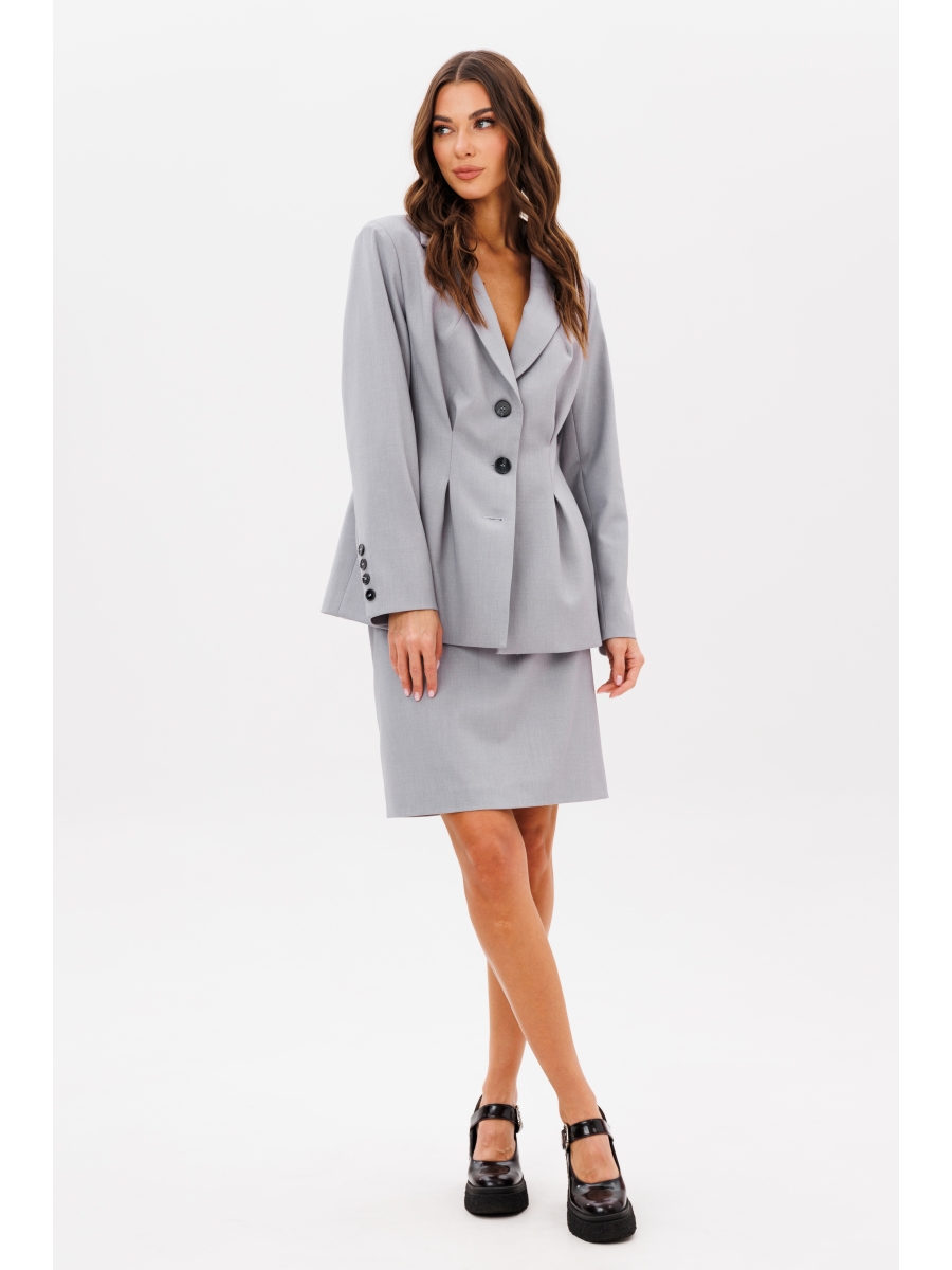 Пиджак полуприлегающего силуэта, втачного покроя с центральной застежкой и классическим английским воротником. Полочка с отрезным бочком, с вытачкой защипом и боковым вертикальным карманом. Спинка с центральным швом, боковым рельефом и талиевой и плечевой вытачкой. Рукав двухшовный с отлетной шлицей с отделочными пуговицами.