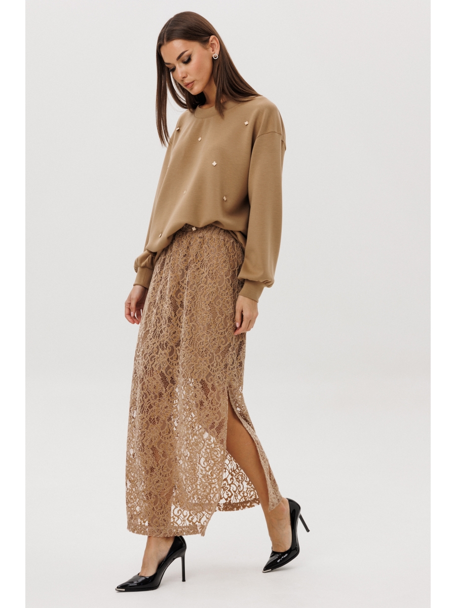 Юбка выполнена из трендового шенилового гипюра с укороченной подкладкой, что придаёт образу лёгкость и современную многослойность.