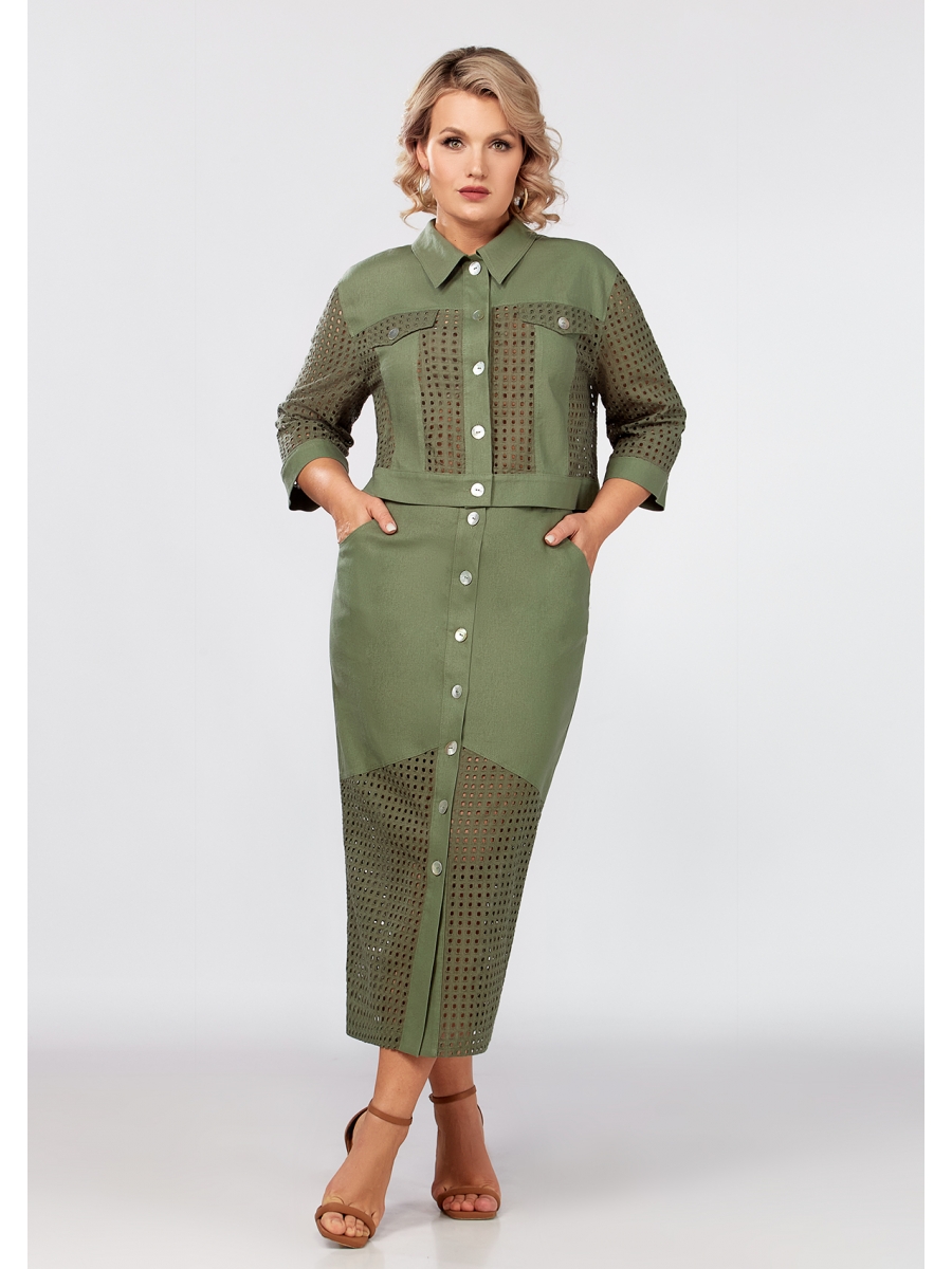 Летний комплект, состоит из юбки и куртки, выполнен из однотонного льна и вышитого хлопка в тон. Куртка выполнена в классическом стиле трендовых направлений. Горловина обработана втачным воротником, застежка по переду на планку с пуговицами. На полочке выполнена кокетка из однотонного льна, рельефы и клапан из вышитого хлопка, по низу планка из однотонного льна. Спинка также с кокеткой из однотонного льна, нижняя часть спинки из хлопка с вышивкой. Рукав втачной, длиной 3/4, выполнен из хлопка с вышивкой, по низу на манжете из однотонного льна. Юбка с застежкой по переду на планку с пуговицами, верхний срез обработан притачным поясом, в боковых швах карманы. Нижняя часть юбки выполнена из хлопка с вышивкой, заднее полотнище юбки идентично переду, также обработана кокетка с прорезными карманами с листочкой.
