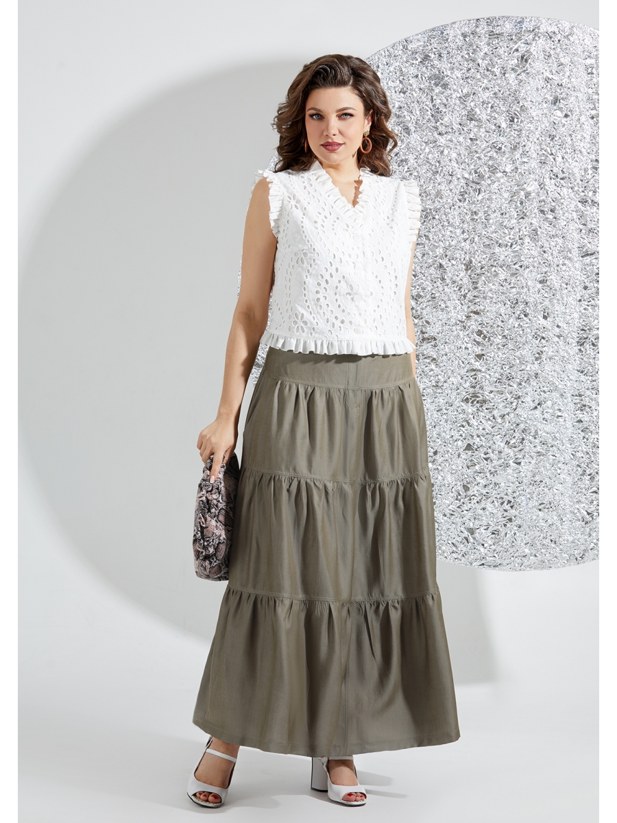 Юбка расклешенная, верхний срез обработан притачным поясом, застежка по переду на молнию. Юбка состоит из трех присборенных воланов, по середине отстрочен шов, также по бокам, на полочке обработаны карманы.
