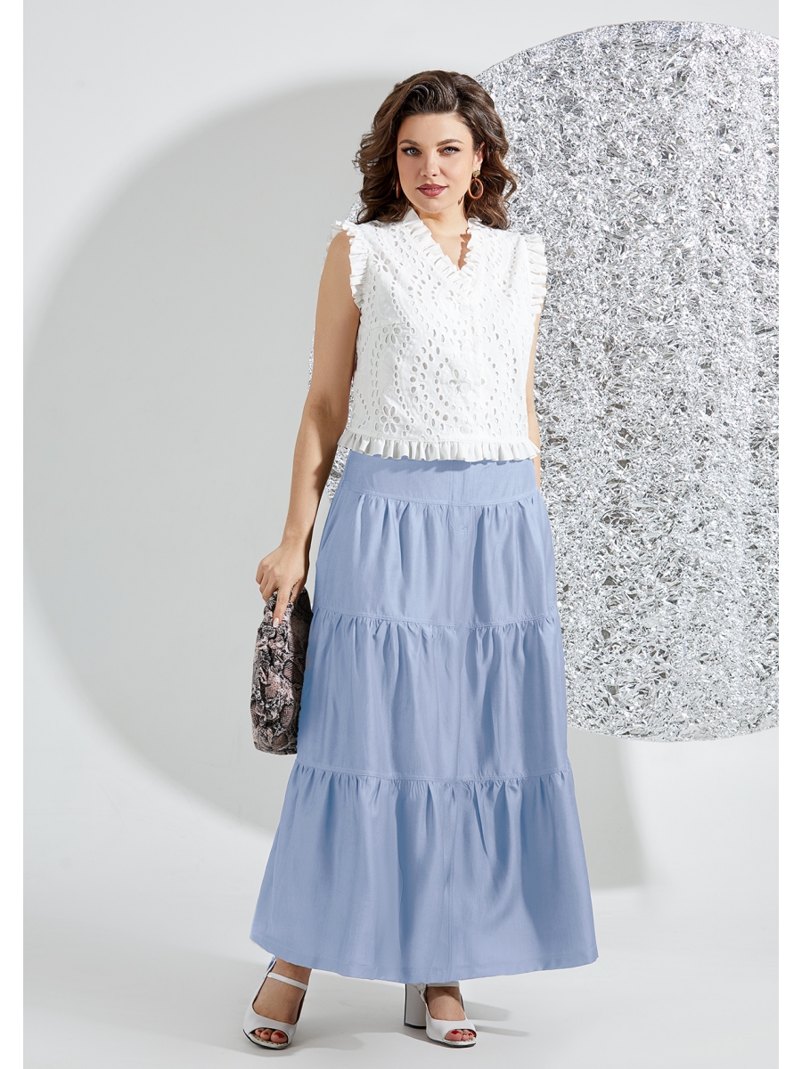 Летний комплект, состоит из блузки, выполненной из хлопкового шитья и юбки, выполненной из тонкого джинса с переливом.