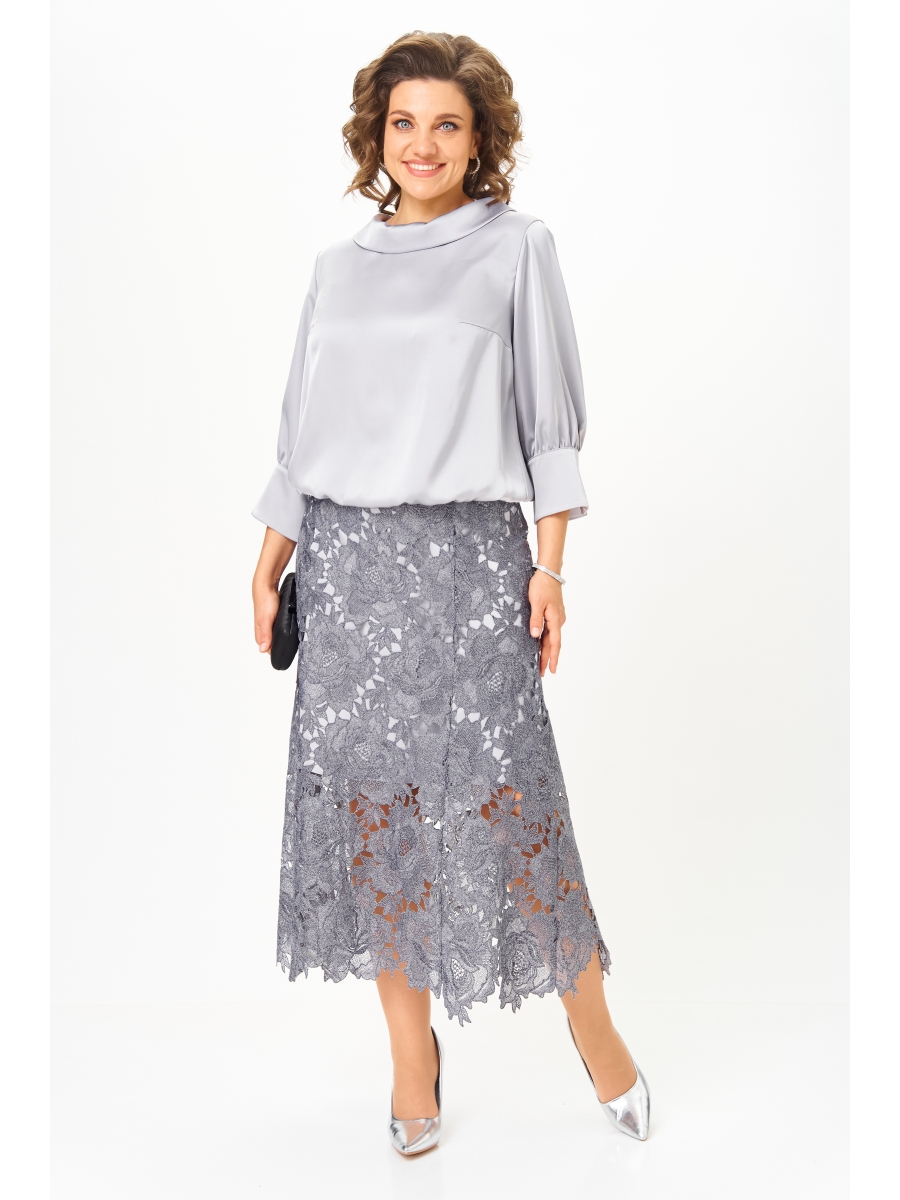 Юбка выполнена из кружева, на подкладке, расклешенная к низу. На переднем и заднем полотнище выполнены клинья, на заднем полотнище, в среднем шве потайная молния, верхний срез на обтачке.