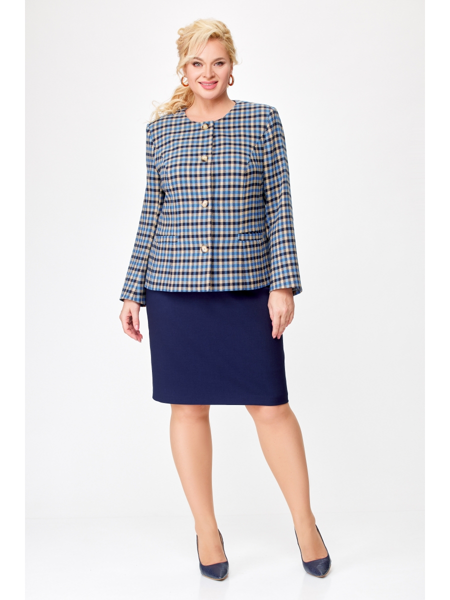 Комплект 2-х предметный, состоящий из жакета и юбки. Жакет однобортный на подкладке. По переду обработаны рельефы и прорезные карманы с листочкой. Спинка со средним швом и рельефами. Рукав втачной двухшовный с обтачной шлицей в локтевом шве. На шлицах рукавов пришиты по три декоративные пуговицы. Горловина обработана обтачкой. Застежка на 4 пробивные петли и 4 пуговицы. Длина по спинке 60 (+-1) см., длина рукава р-р 52-56 - 60 (+-1) см.,