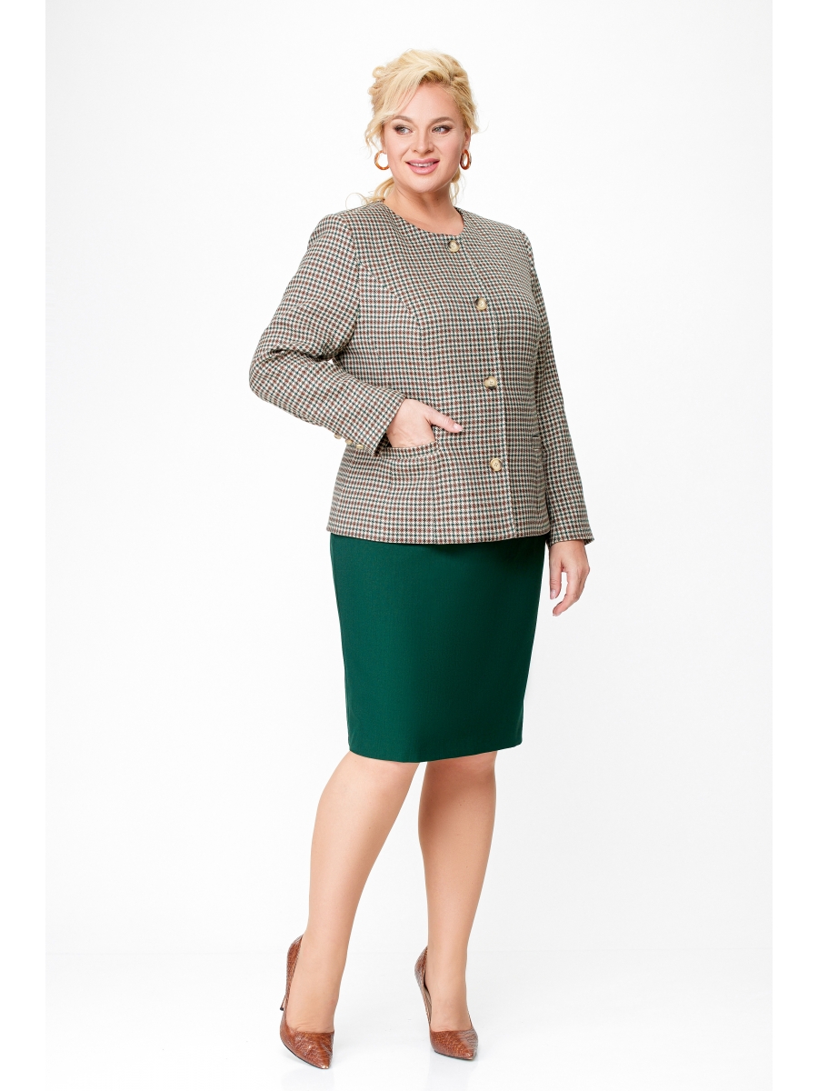Комплект 2-х предметный, состоящий из жакета и юбки. Жакет однобортный на подкладке. По переду обработаны рельефы и прорезные карманы с листочкой. Спинка со средним швом и рельефами. Рукав втачной двухшовный с обтачной шлицей в локтевом шве. На шлицах рукавов пришиты по три декоративные пуговицы. Горловина обработана обтачкой. Застежка на 4 пробивные петли и 4 пуговицы. Длина по спинке 60 (+-1) см., длина рукава р-р 52-56 - 60 (+-1) см.,