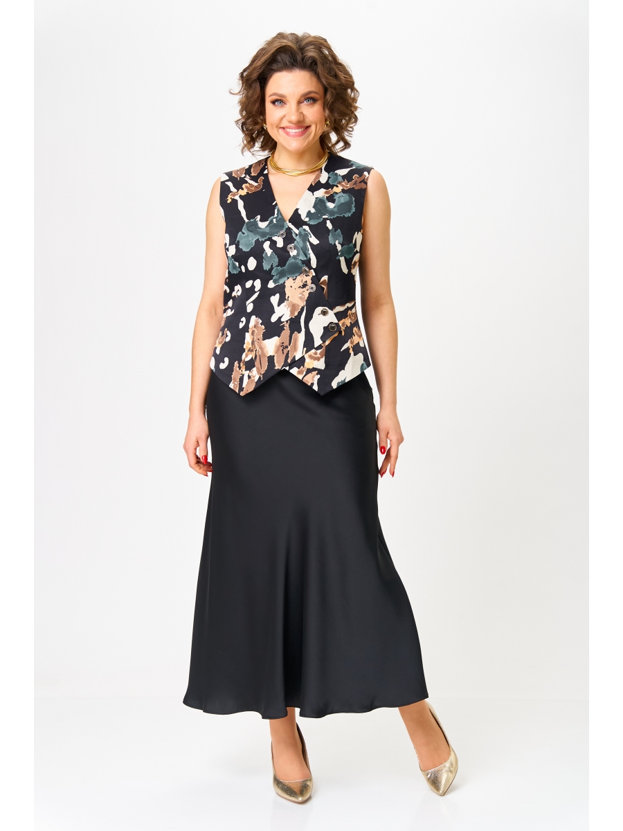 Стильный женский комплект, выполнен из атласа, жилет по переду из атласа с принтом, спинка и юбка из однотонного.