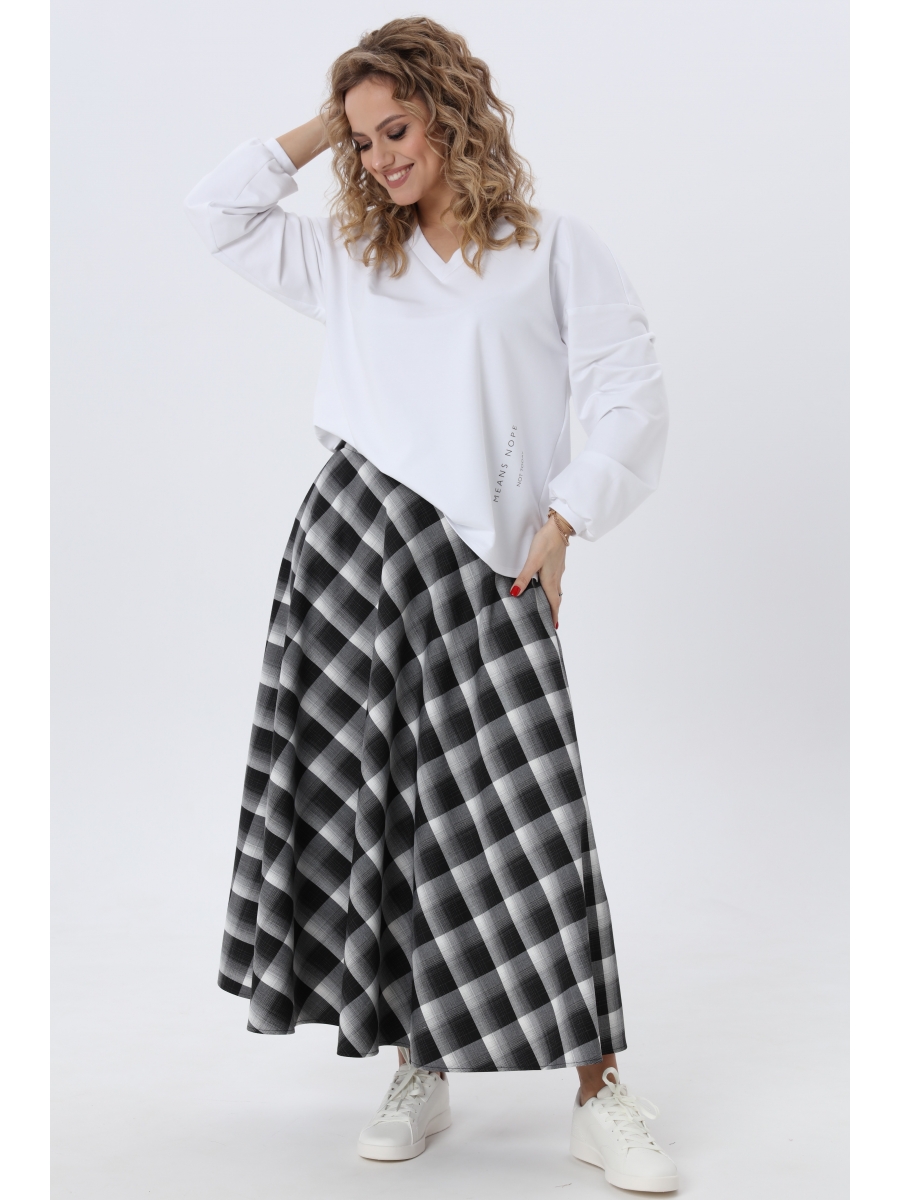 Классическое сочетание белого джемпера с юбкой кроя полусолнце в черно-белую клетку.