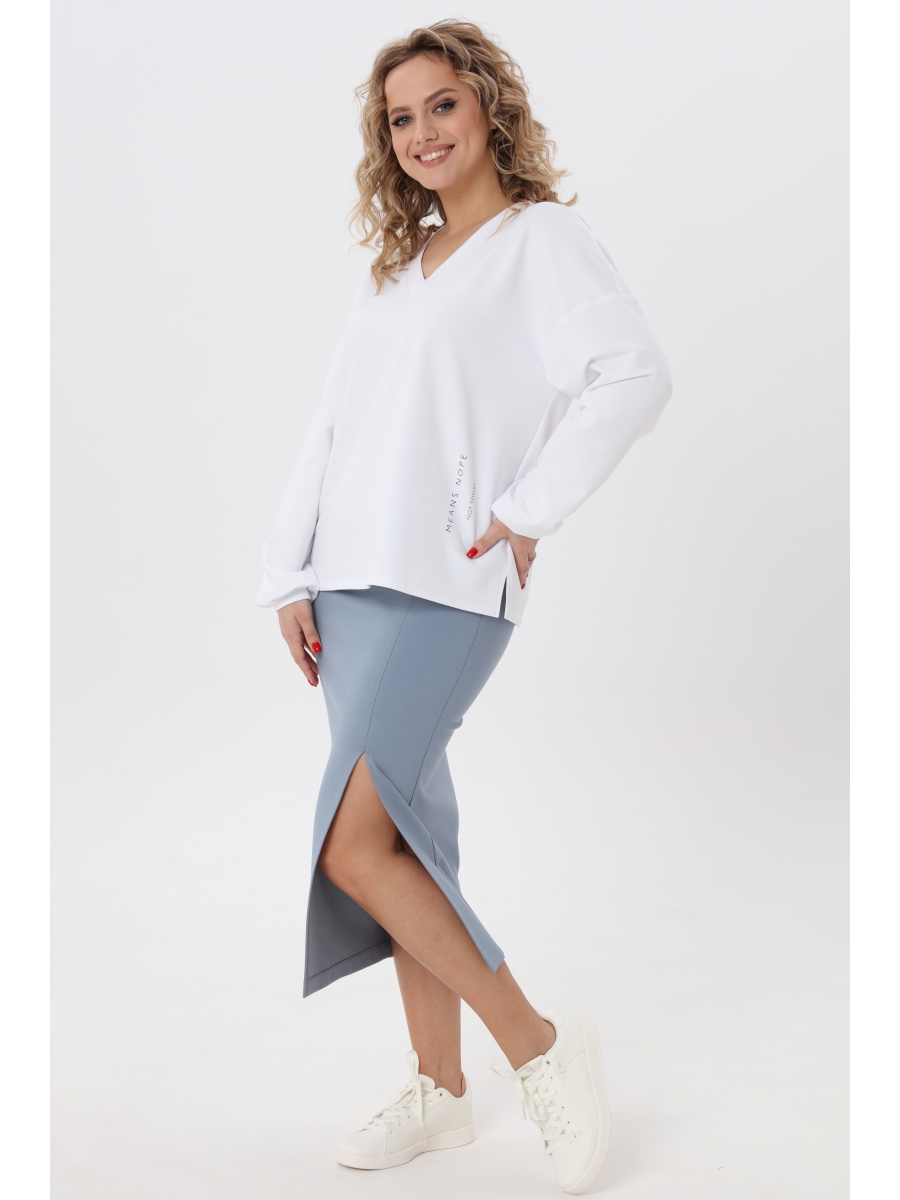 Джемпер прямого силуэта с разрезами в боковых швах. V-образный вырез горловины удлинит шею и визуально вытянет силуэт. Рукав втачной длинный со спущенной линией плеча, по низу рукава сборка и притачная манжета. По переду выполнена декоративная надпись.