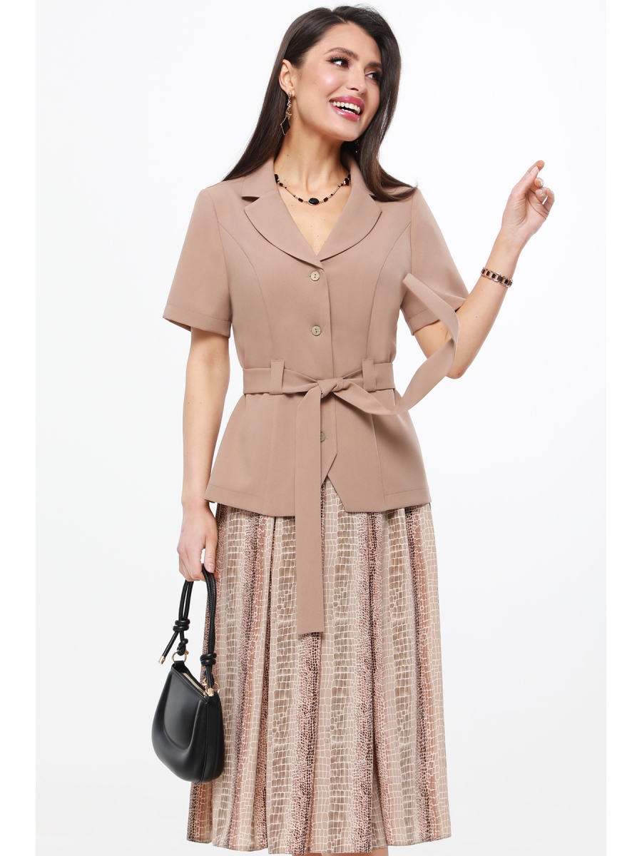 Костюм из жакета и юбки, одновременно строгий по силуэту и нежный по цветовым сочетаниям. Жакет с коротким рукавом без подклада выполнен из костюмной ткани габардин и дополнен поясом, который удобно фиксируется благодаря шлевкам. Юбка из шифона с подкладом на резинке придает образу легкость. Особый плюс костюма в том, что он создан из комплиментарных, но разных тканей, благодаря чему жакет и юбка будут так же хорошо смотреться и самостоятельно, в сочетании с другими вещами вашего гардероба.