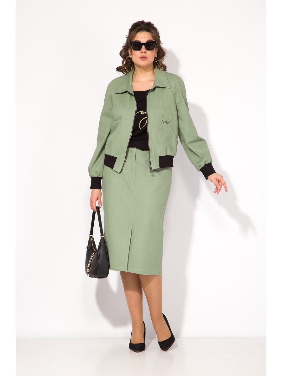 Юбка в костюме длиной за колена, прямая. По центру шов переходящий в разрез. Юбка на притачном поясе, в боковых швах вставлена резинка на комфортное прилегание. Застежка юбочная тесьма-молния по переду.