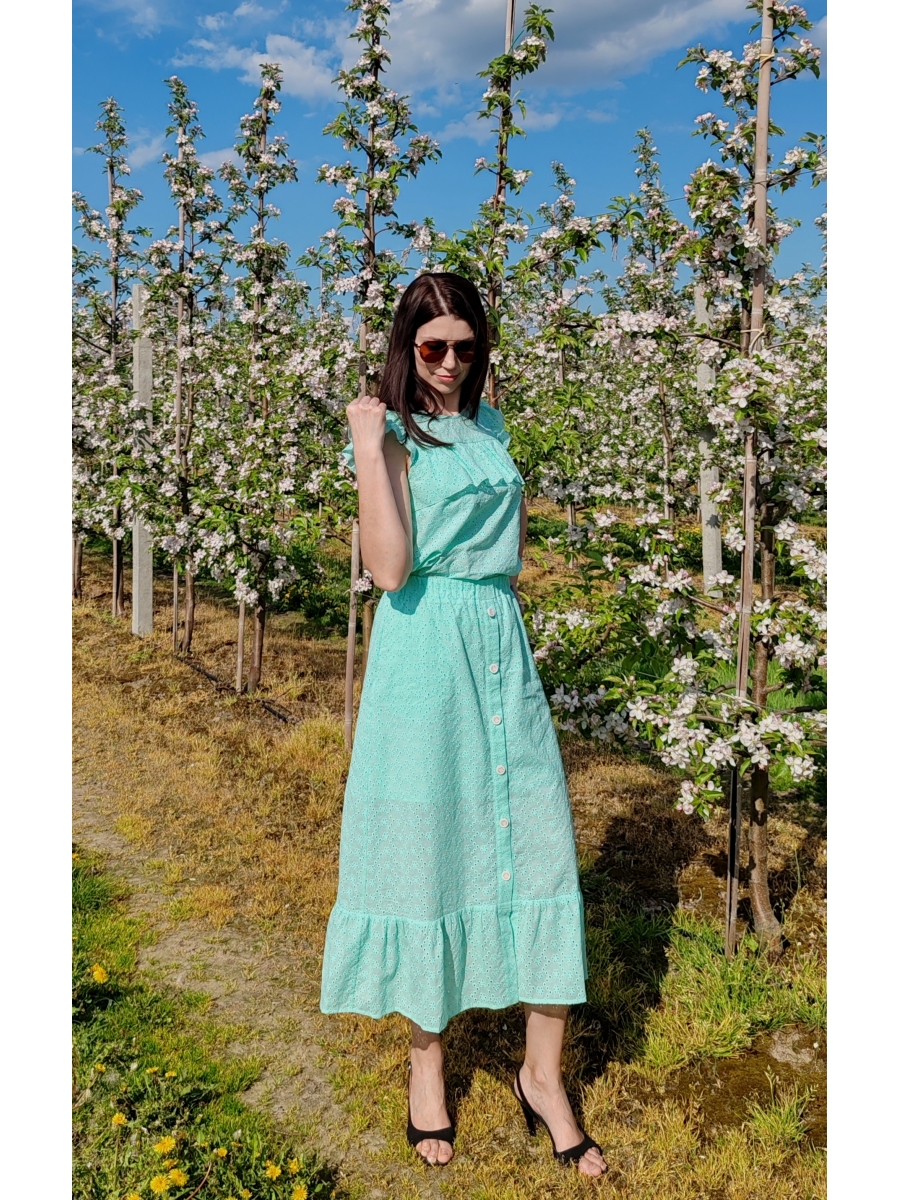 Оформить заказ →Комплект из хлопковой ткани «ришелье». Блуза прямого силуэта. Горловина круглой формы. Воланы по переду и проймам. Длина блузы по центру спинки - 55 см. Юбка слегка расширена книзу. Верх юбки на поясе с резинкой. Перед с застежкой на петли-пуговицы. В боковых швах расположены карманы. По низу юбки волан. Длина юбки с поясом – 88 см. Рост модели на фото 170 см