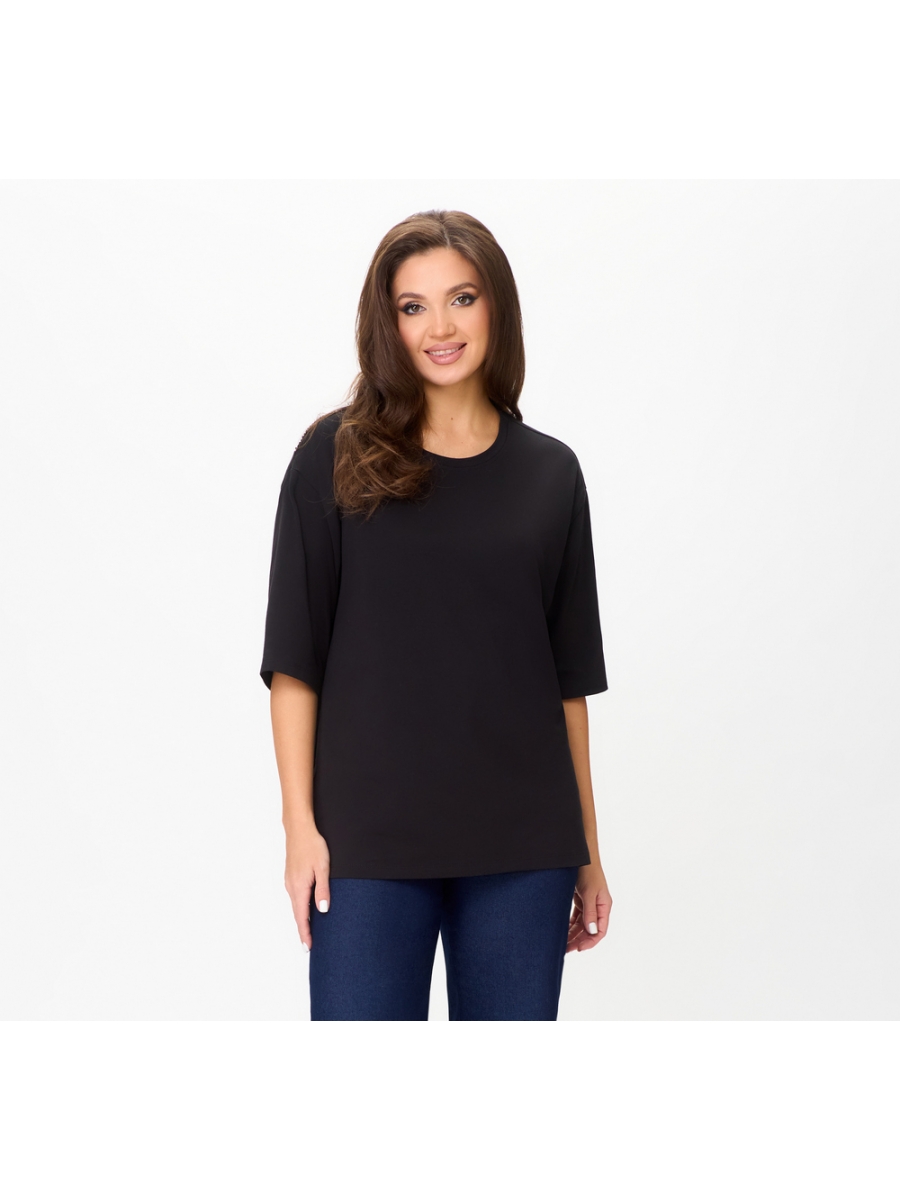 Джемпер женский прямого силуэта с втачным спущенным рукавом. Украшением служит асимметричная деталь из пайеток по спинке. Горловина обработана бейкой. Низ футболки и рукавов обработаны на плоскошовной машине. Шов втачивания горловины с отстрочкой