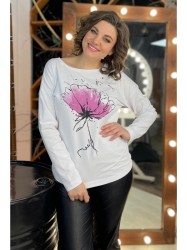 Джемпер из трикотажной хлопковой ткани, со спущенным плечом. Перед джемпера с принтом. Вырез горловины круглый, оформлен бейкой. Спинка без среднего шва.
