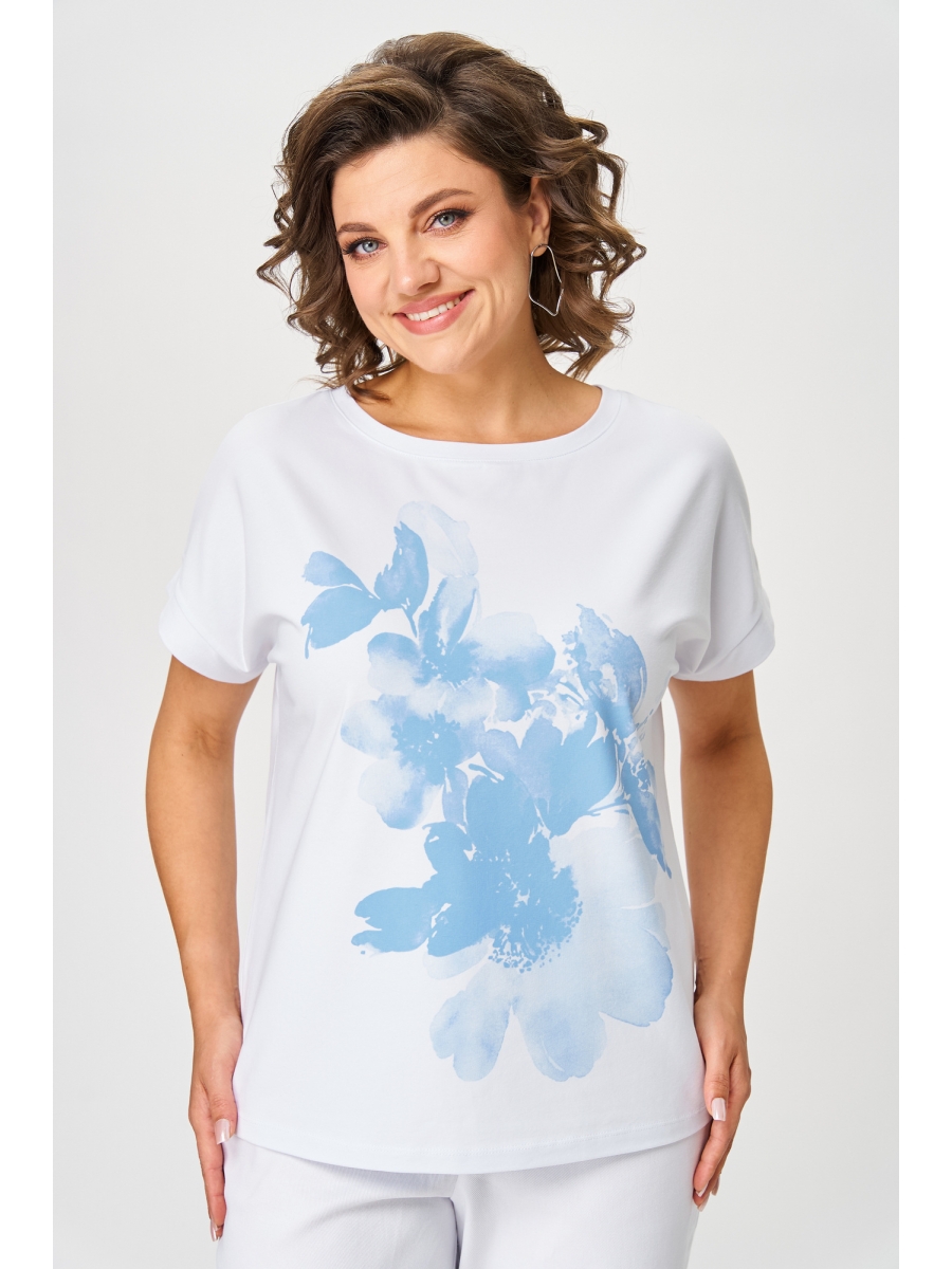 Джемпер из трикотажной хлопковой ткани. Перед футболки с принтом. Спущенное плечо, оформлено притачной манжетой. Вырез горловины круглый, оформлен бейкой. Спинка без среднего шва.
