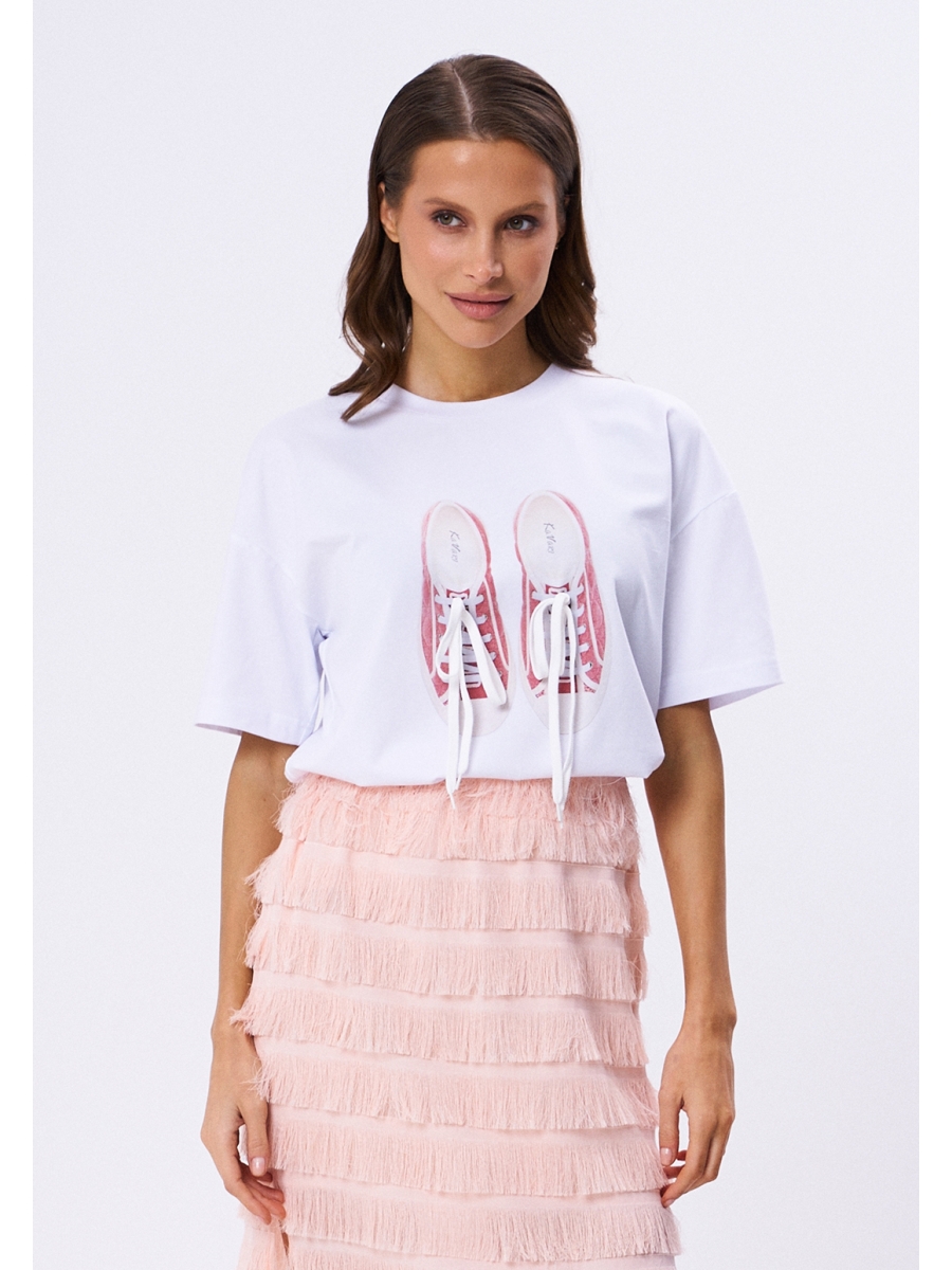 Объёмная футболка со спущенной линией плеча. По переду принт «кеды» со шнурками, завязанными на бантик.