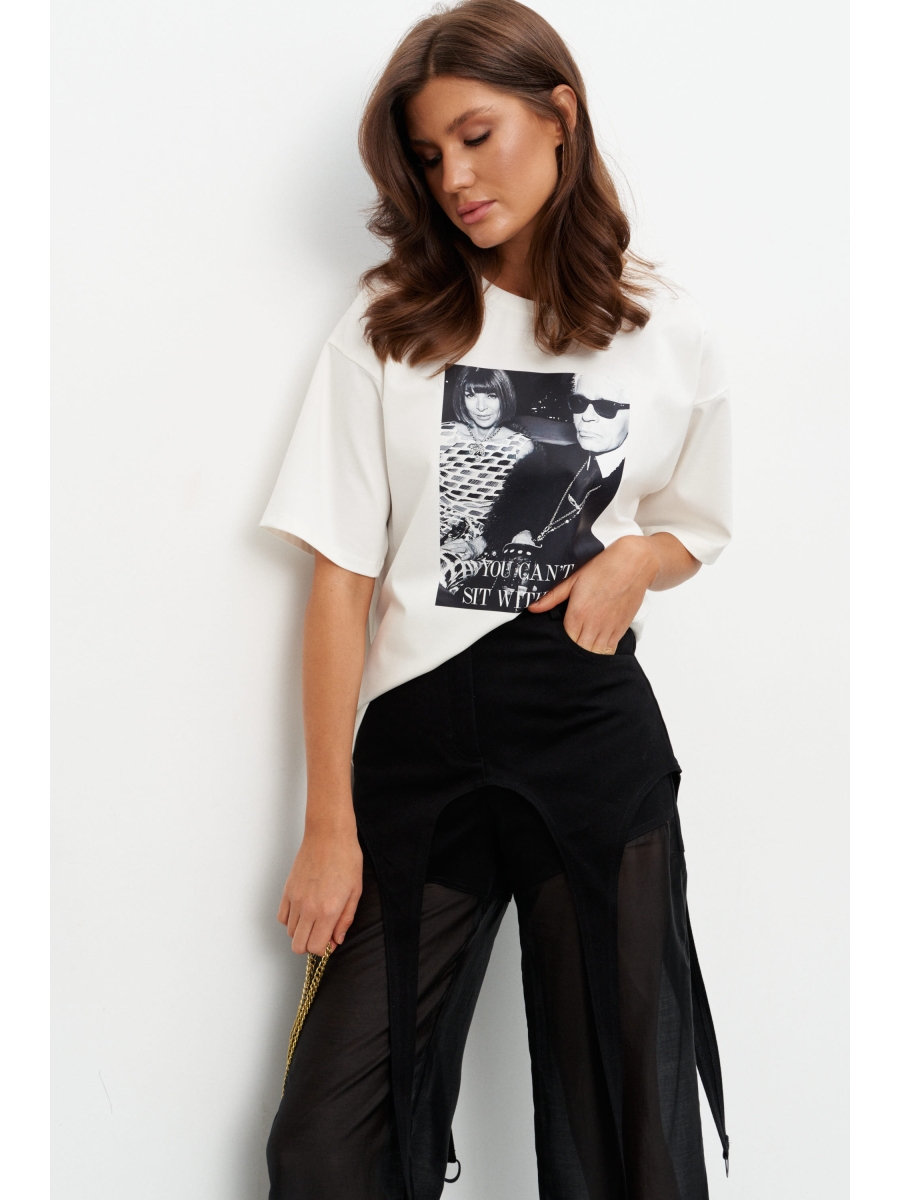 Оверсайз футболка из плотного трикотажа с контрастным принтом «Карл». Линия плеча спущена, горловина отделана эластичной бейкой.