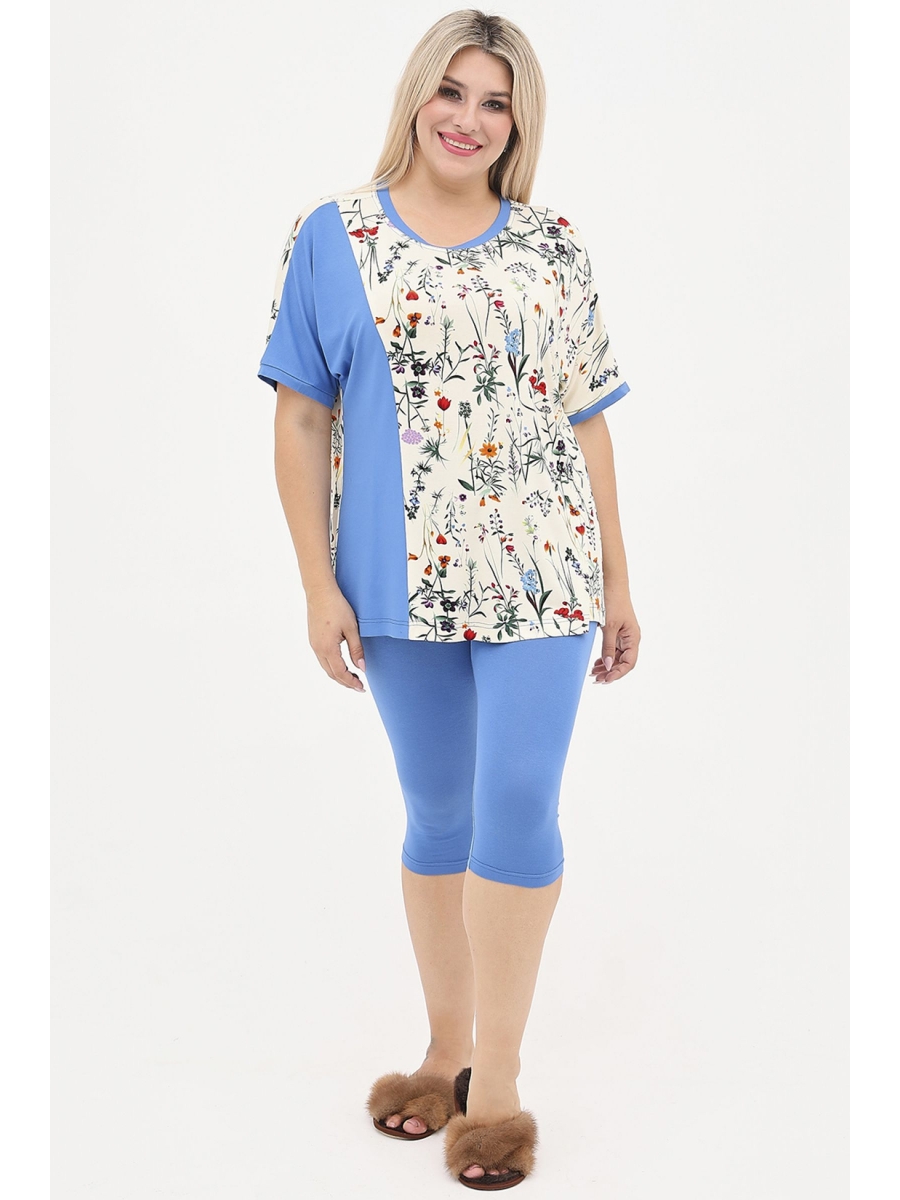 Яркий костюм из вискозного трикотажа. Комбинированная футболка приталенного силуэта, перед и спинка выполнены из трикотажа принт, с правой стороны переда подрезной бочок из однотона. Круглый вырез горловины и короткие цельнокроенные рукава дополнены однотонной бейкой. Низ прямой. Велосипедки выполнены из однотонного трикотажа, модель с комфортной посадкой, пояс на резине.