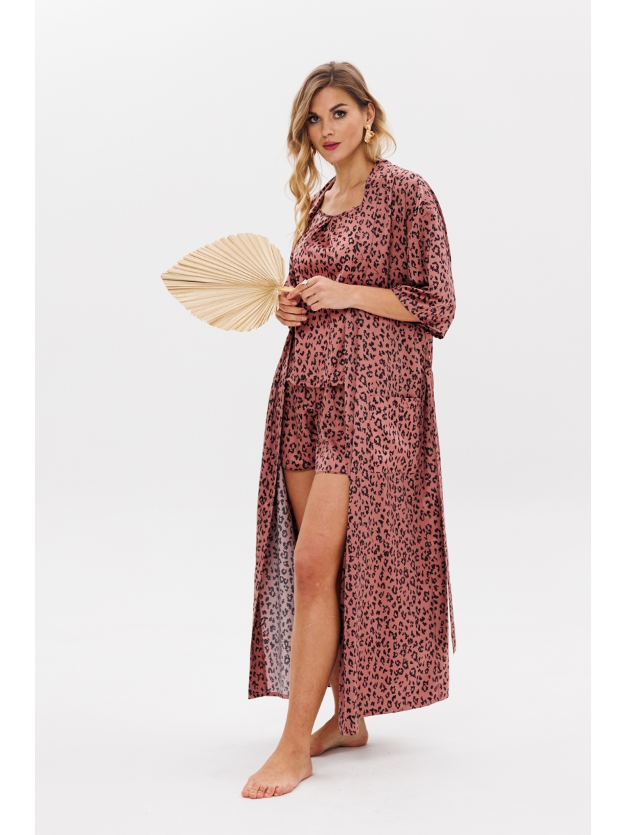 Классический костюм для дома из атласной ткани, состоящий из халата, свободного топа и коротких шортиков - комфортная одежда для сна и отдыха.