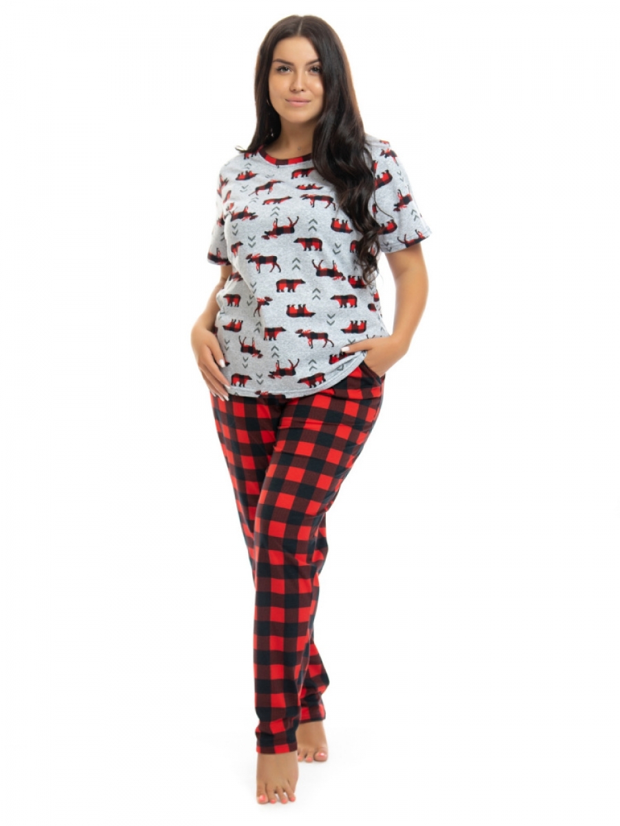 Костюм женский футболка и брюки.Футболка полуприлегающего силуэта,рукав короткий.Горловина круглая обработана обтачкой в цвет брюк.Брюки прямые чуть заужены к низу,пояс на эластичную резинку,внутренние карманы.