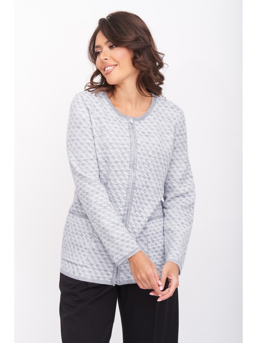 Женский вязаный жакет полуприлегающего силуэта. По переду застегивается на молнию, вырез горловины круглый. Рукава втачные длинные. Два накладных кармана квадратной формы. Жакет выполнен жаккардовым переплетение образуя неброский рисунок.
