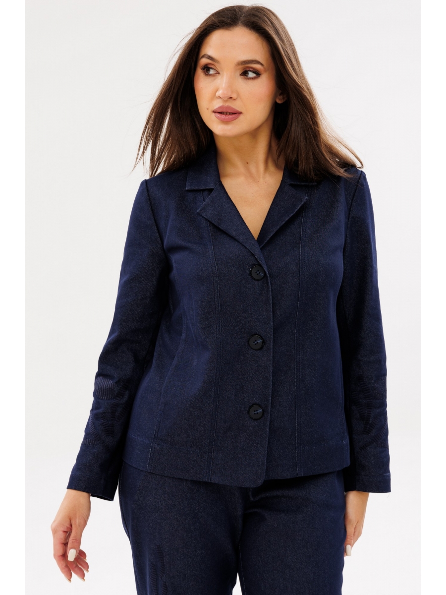 Жакет полуприлегаюшего силуэта. Воротник пиджачного типа, застежка центральная однобортная на три петли и пуговицы. Полочка с рельефами, в которых расположены функциональные карманы. Рукав втачной одношовный. На рукавах расположена дизайнерская вышивка. Жакет без подкладки.