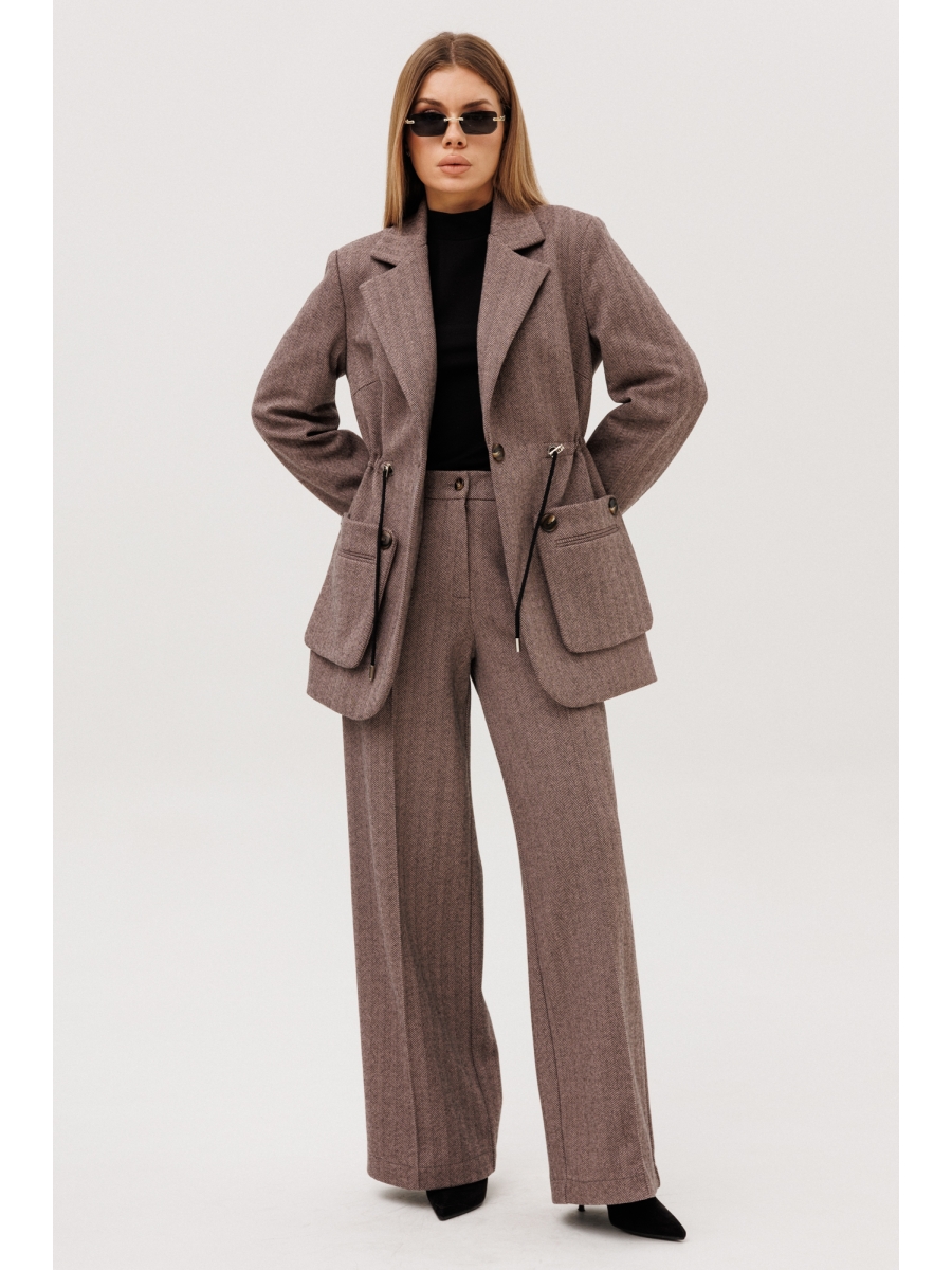 Оформить заказ →Жакет свободного силуэта с регулирующей кулисой по линии талии. Застежка на петлю пуговицу. По переду действующие накладные карманы. Изделие на подкладке. Изделие из утепленной ткани.