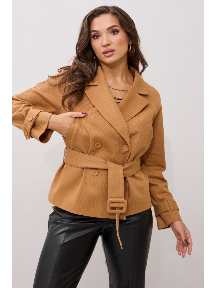 Жакет двубортный прямого силуэта. Спинка со средним швом. Перед с рельефами, переходящими в карман. Рукав реглан, длинный, снизу рукава шлевки, в которые продета пата с застежкой на две обтяжные пуговицы. Застежка жакета на обтяжные пуговицы и пояс с обтяжной пряжкой. На груди - косые прорезные карманы с листочкой.