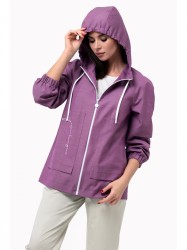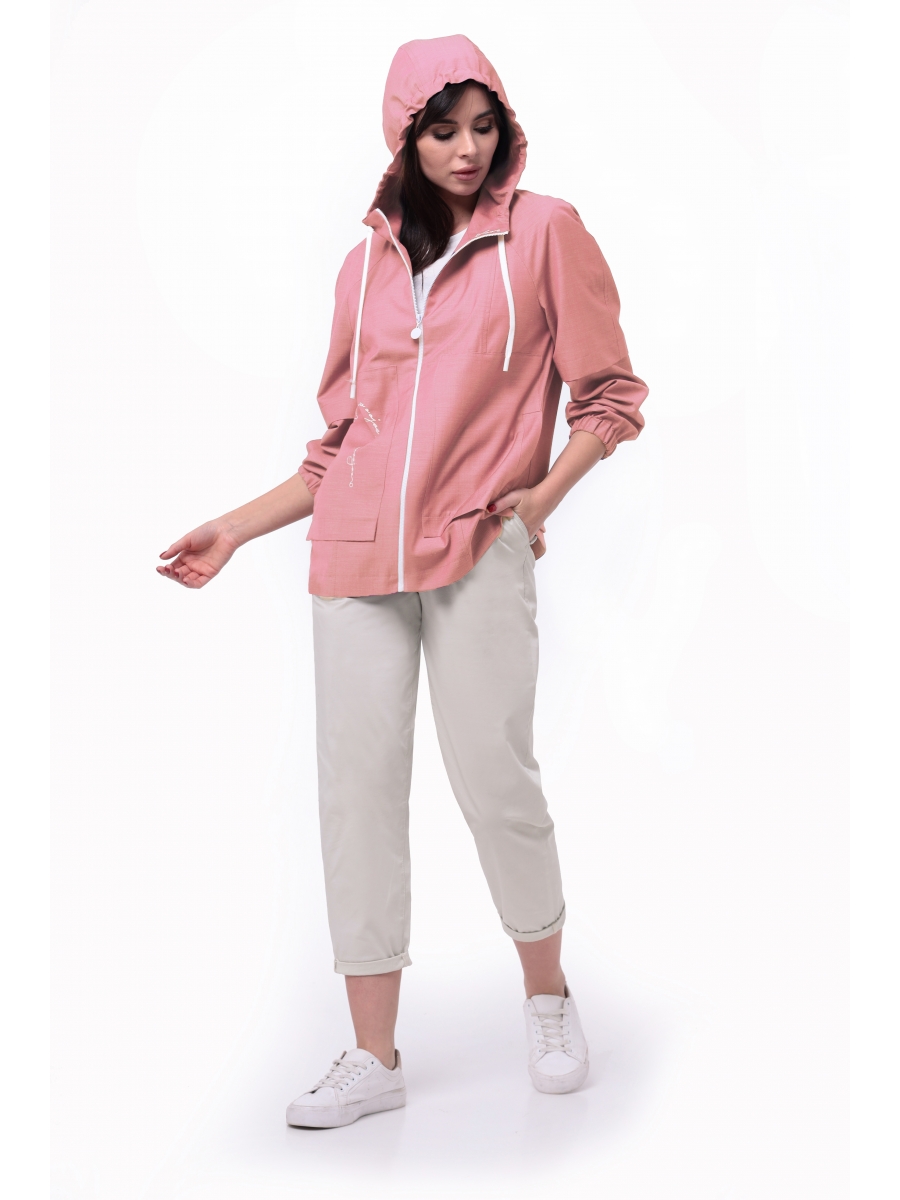 Жакет женский без подкладки на молнии с копюшоном и накладными карманами по переду. Правый карман декорирован печатью. Рукав реглан, по низу резинка. Спинка с кокеткой и частично вставленной резинкой.