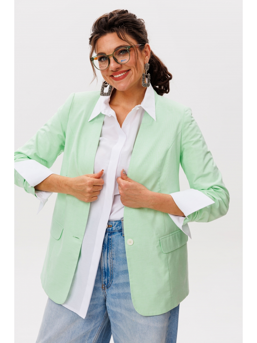 Легкий жакет нежного мятного оттенка «мохито» станет идеальным дополнением теплого сезона. Полуприлегающий силуэт с элегантной стойкой подчеркивает изящные линии фигуры, сохраняя при этом комфорт и свободу движения.