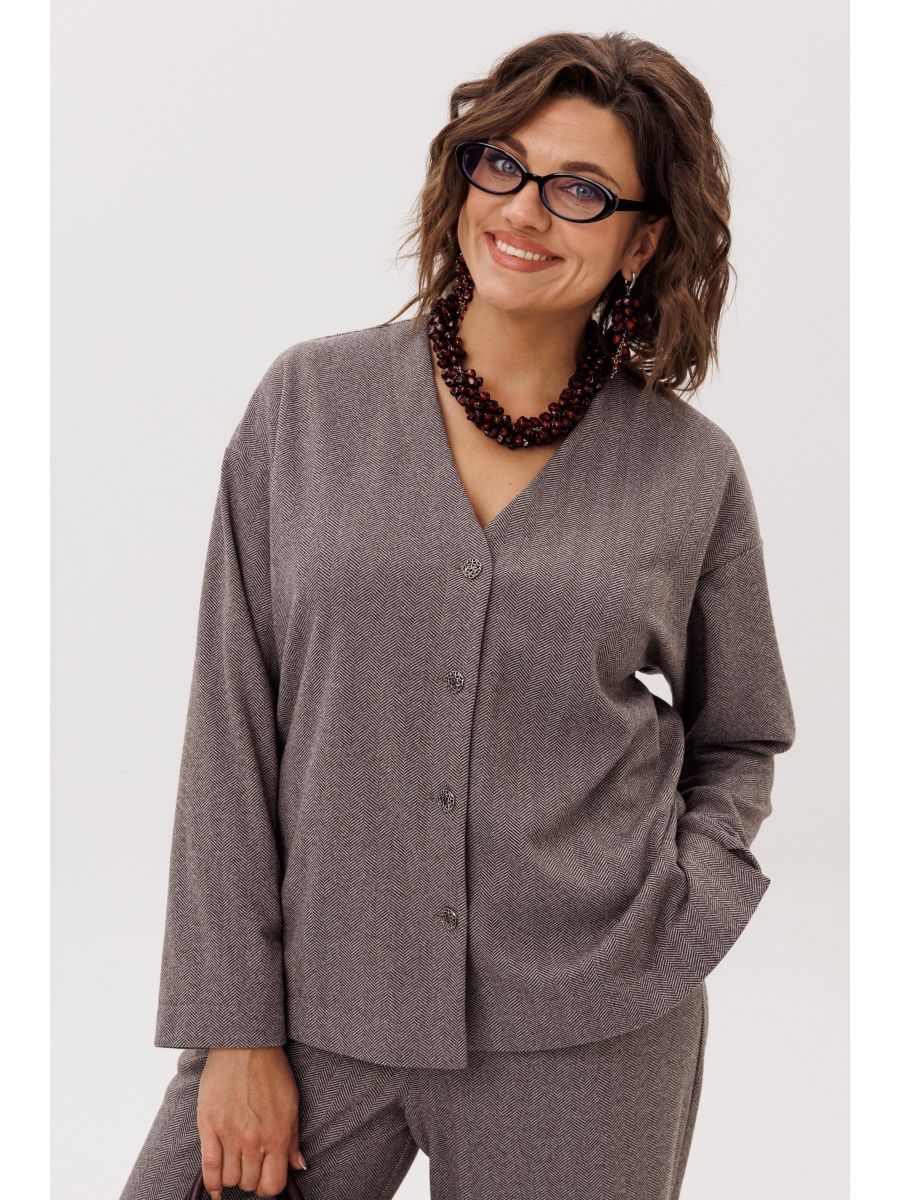 Его прямой силуэт со спущенным плечом и изящными разрезами по бокам струится легко и свободно, подчеркивая достоинства, не сковывая движений. Глубокий V-образный вырез горловины добавляет образу женственности и строгой элегантности, а классическая застежка на пуговицы завершает безупречный вид.