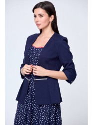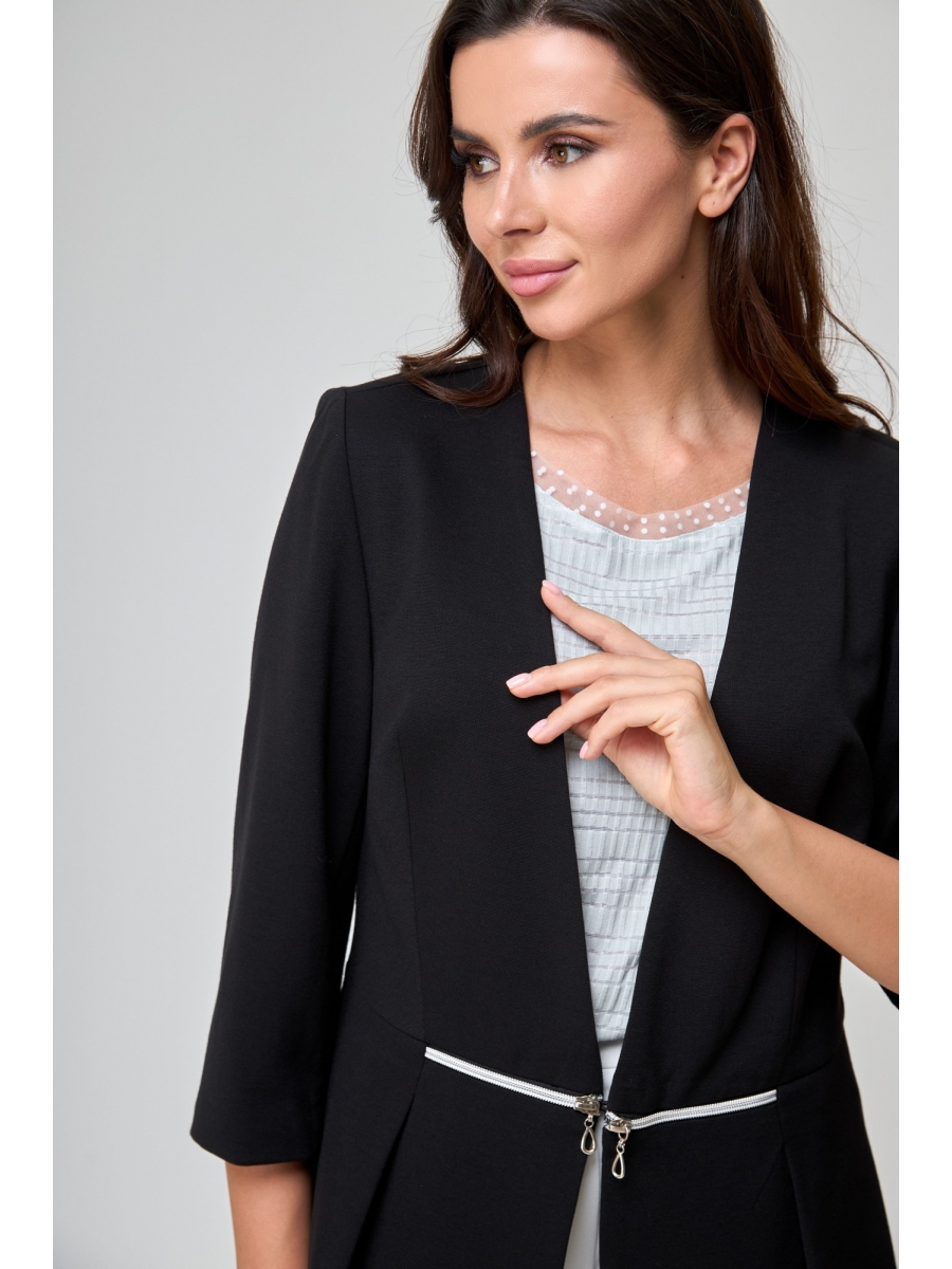 Жакет женский полуприлегающего силуэта, длиной до середины бедра, на подкладке. Рукав втачной, длина 3/4, по низу шлица на петлю пуговицу. Жакет отрезной по линии талии, нижняя часть выполнена в виде баски со складками. По переду и спинке талиевые вытачки, в талиевые швы переда вставлены декоративные молнии.