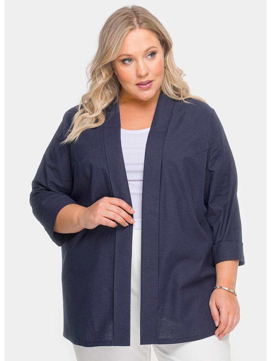 Жакет прямого силуэта из смесовой ткани, содержащей в составе лен и вискозу.. По бортам и низу рукавов притачные отвороты.