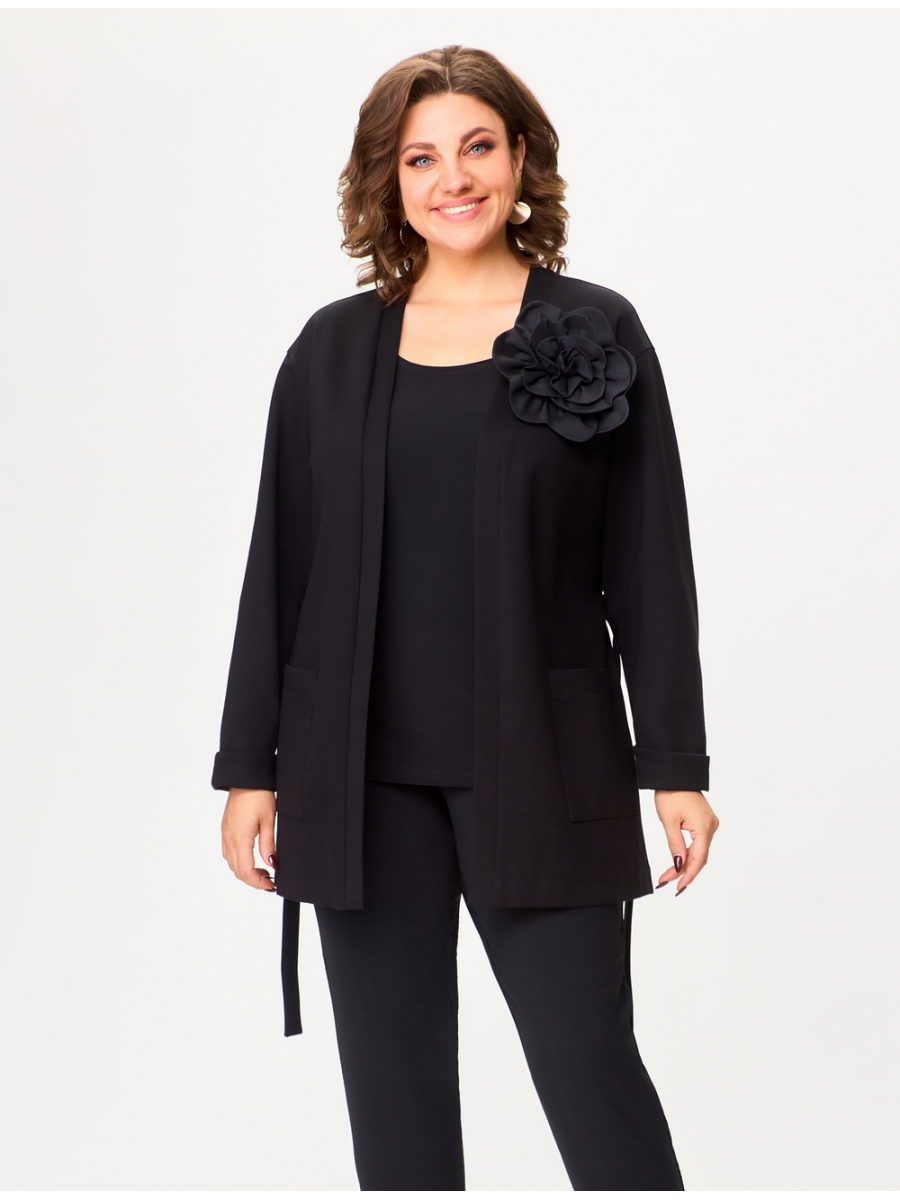 Жакет женский свободного прямого силуэта, длиной ниже линии бедер. Жакет трикотажный, без подкладки со съемным поясом и накладными карманами. По переду и горловине спинки притачная планка, без застежки. Линия плеча слегка спущена. Рукав втачной длинный с отложной манжетой. В боковых швах разрезы. Украшен жакет съемным цветком из отделочной ткани.