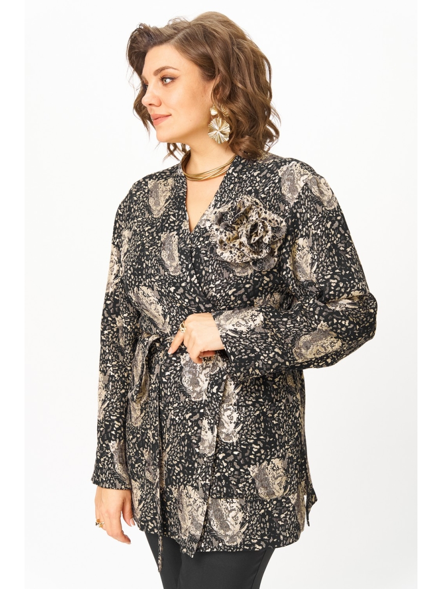 Жакет женский свободного прямого силуэта, длиной ниже линии бедер. Жакет без подкладки со съемным поясом и накладными карманами. По переду и горловине спинки притачная планка, без застежки. Линия плеча слегка спущена. Рукав втачной длинный с отложной манжетой. В боковых швах разрезы.