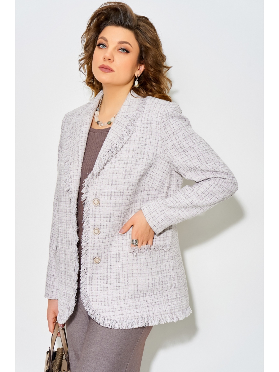 Нарядный женский жакет "Плеяна" выполнен из твидовой ткани с блестящей нитью. Модный жакет на подкладке полуприлегающего силуэта, воротник отложной, по борту лацканы, низ борта закругленный, застежка однобортная на три пуговицы. По полочке - рельеф и накладной карман, по краю кармана трепка. Края воротника, лацканов и борта обработаны трепкой. По спинке - рельефы, рукав втачной двухшовный. Жакет нарядный отличный вариант для праздников и повседневной носки.