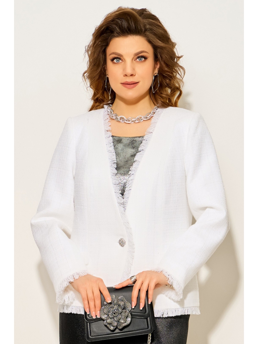 Однобортная застёжка на пуговицу, рельефные линии по полочке и спинке подчёркивают фигуру. Декоративная трепка по краю борта, низу изделия и рукавам добавляет фактурности и оригинальности.