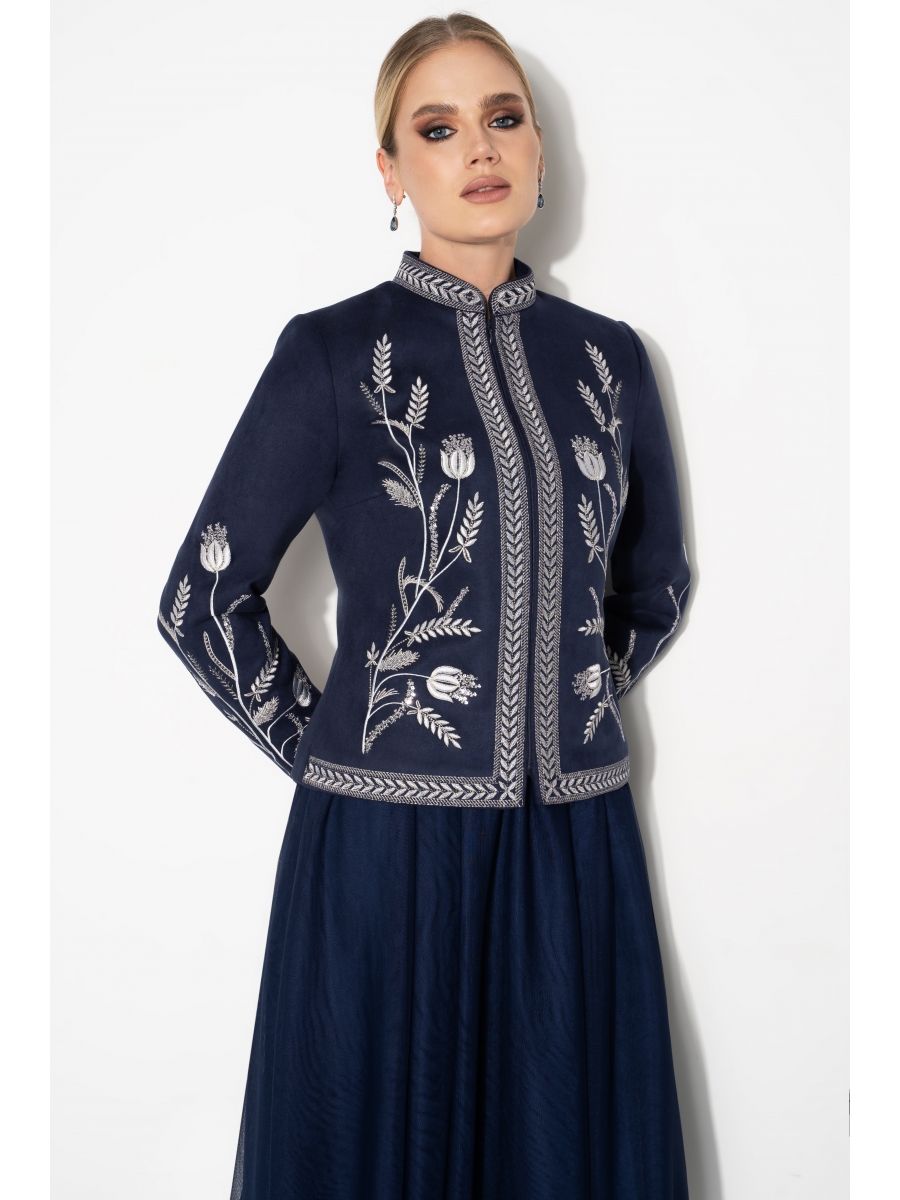 Жакет, украшенный вышивкой, приобретают некую уникальность. Растительные узоры эффектно дополняют благородную ткань. Благодаря вышивке жакет становятся более женственным и изысканным. Жакет женский из мягкой искусственной замши на трикотажной основе полуприлегающего силуэта с художественной вышивкой, на подкладке, однобортный, с центральной застежкой до верха на молнии.
