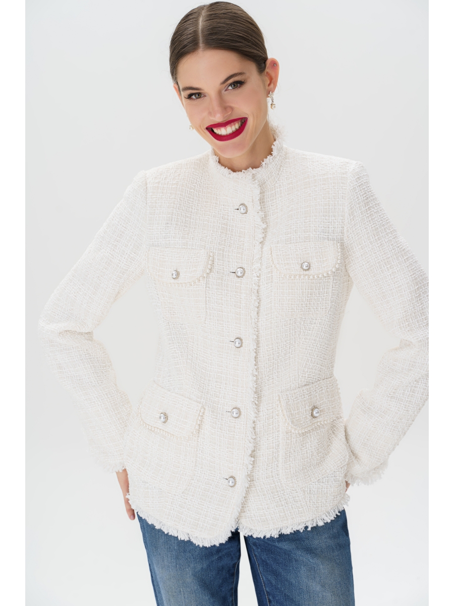 Этот жакет в стиле Шанель выполнен из молочного твида, что придает ему особый шарм и элегантность. Красивая отделка и фурнитура дополняют образ, делая его еще более изысканным. Жакет идеально подойдет для создания строгого, но в то же время женственного образа. Он прекрасно сочетается с платьями и юбками, а также с джинсами и брюками. Благодаря качественным материалам и мастерству исполнения, жакет сохранит свою форму и внешний вид на долгое время. В этом жакете вы будете выглядеть стильно и уверенно в любой ситуации. Жакет женский полуприлегающего силуэта на подкладке, нарядный.