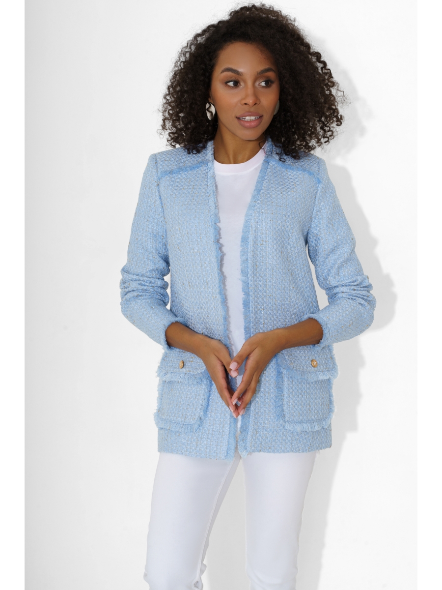 Жакет в стиле Шанель – незаменимая вещь женского гардероба, поскольку, данная модель одежды весьма удачно дополняет образы разного стиля. Эта модель универсальная, она подойдет любой женщине, независимо от её возраста, предпочитаемого стиля одежды и телосложения. Жакет женский полуприлегающего силуэта из костюмной ткани типа Chanel без застежки, с отделочным элементом по борту и горловине - бахрома (из основной ткани).
