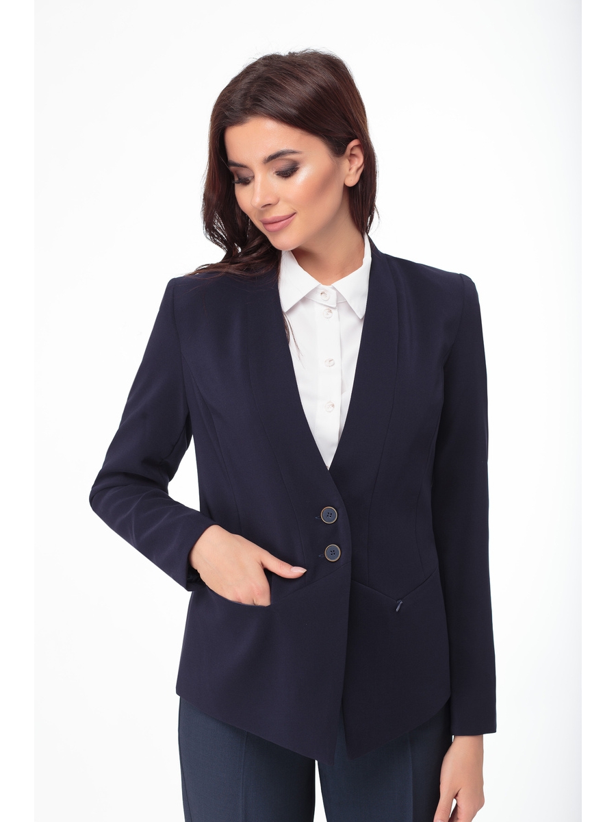 Жакет полуприлегающего силуэта с рельефными швами по переду и спинке, V-образным вырезом, что придаёт образу женственность-хрупкость и уверенность одновременно.