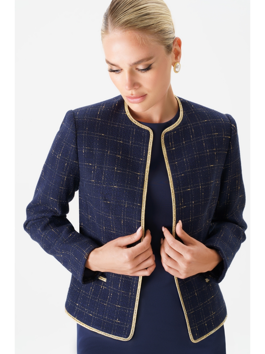 Жакет полуприлегающего силуэта без застежки. Перед со смещенными рельефами, идущими от пройм вниз, с нагрудными вытачками идущими от рельефов к центрам, в нижней части с прорезными карманами с листочками. Спинка с рельефными швами, идущими от пройм вниз. Рукава втачные, двухшовные, длинные. Горловина переда и спинки округлой формы, обтачная. Край борта, горловина, низ переда и спинки, листочки карманов декорированы тесьмой (размер и цвет тесьмы может незначительно отличаться от фото). Жакет с плечевыми накладками.