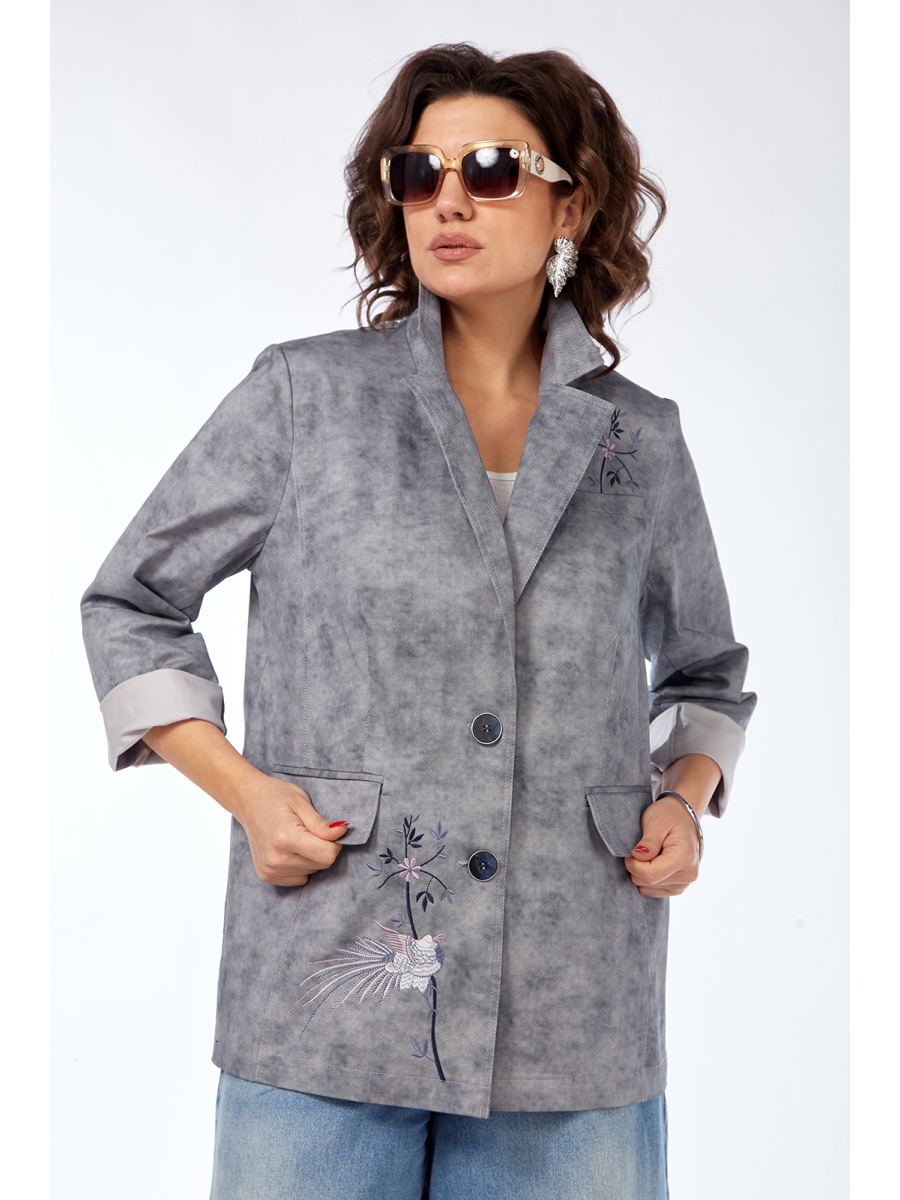 Жакет женский, прямого силуэта, выполнен из хлопковой ткани костюмного ассортимента. Воротник пиджачного типа, застежка центрально-бортовая на две петли и пуговицы. По переду обработана нагрудная листочка и прорезные карманы с клапаном и двумя обтачками, фигурные рельефы выходящие из проймы. Спинка со средним швом, в котором имеется высокая шлица. Рукава втачные двухшовные, с широкой подборкой низа. Изделие декорировано дизайнерской вышивкой.