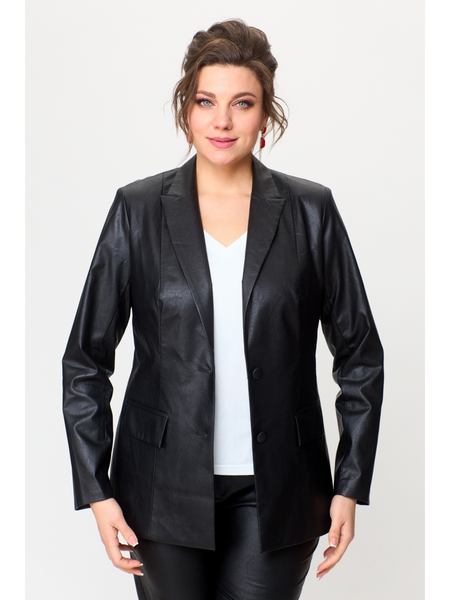 Жакет женский удлиненный, из экокожи, полуприлегающего силуэта с центральной бортовой застежкой на пуговицы до линии перегиба лацкана. Спереди рельефные швы от плечевого шва, отрезной бочок и карман с клапаном. Спинка с рельефами от плечевого шва. Рукав втачной, двухшовный. Воротник пиджачного типа. Жакет на подкладке.