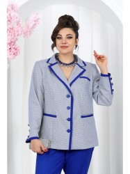 Притачные планки воротника, лацканов, бортов, рукавов и листочки карманов выполнены из контрастной отделочной ткани. Жакет на подкладке, с плечевыми накладками.
