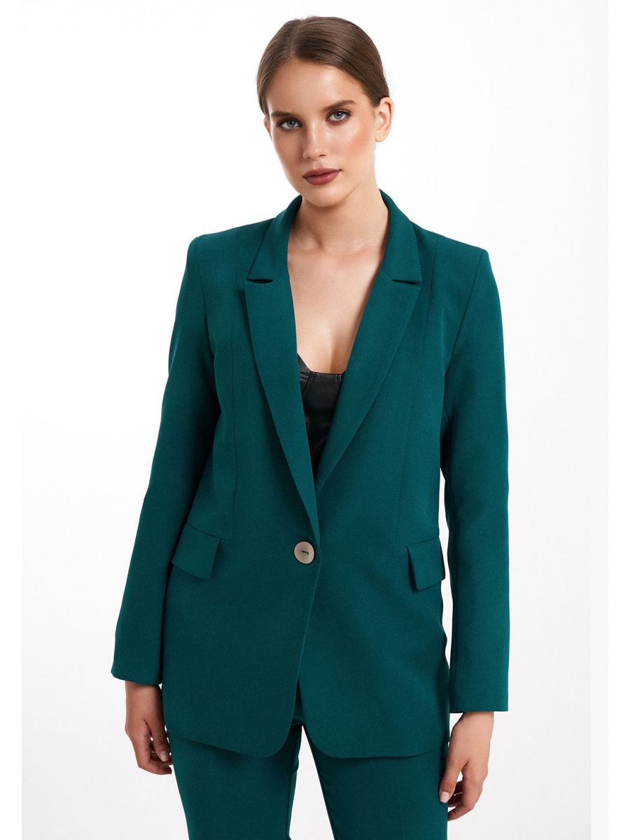 Универсальный женский жакет на подкладке прямого силуэта. Перед с центральной застежкой на одну пуговицу, с карманами и с клапанами в шве. Воротник стояче-отложной втачной с отворотом лацкана. Рукав двухшовный, втачной.