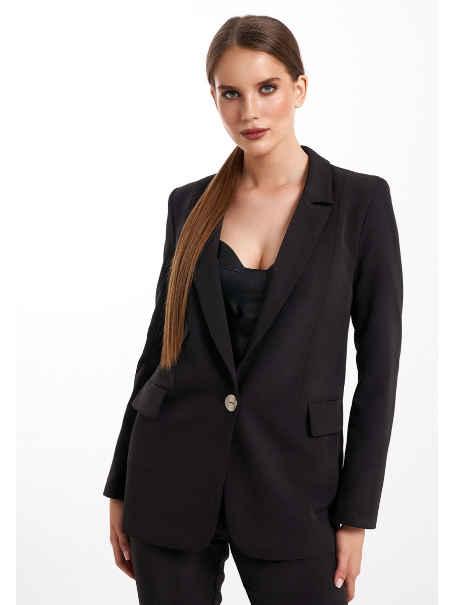 Универсальный женский жакет на подкладке прямого силуэта. Перед с центральной застежкой на одну пуговицу, с карманами и с клапанами в шве. Воротник стояче-отложной втачной с отворотом лацкана. Рукав двухшовный, втачной.