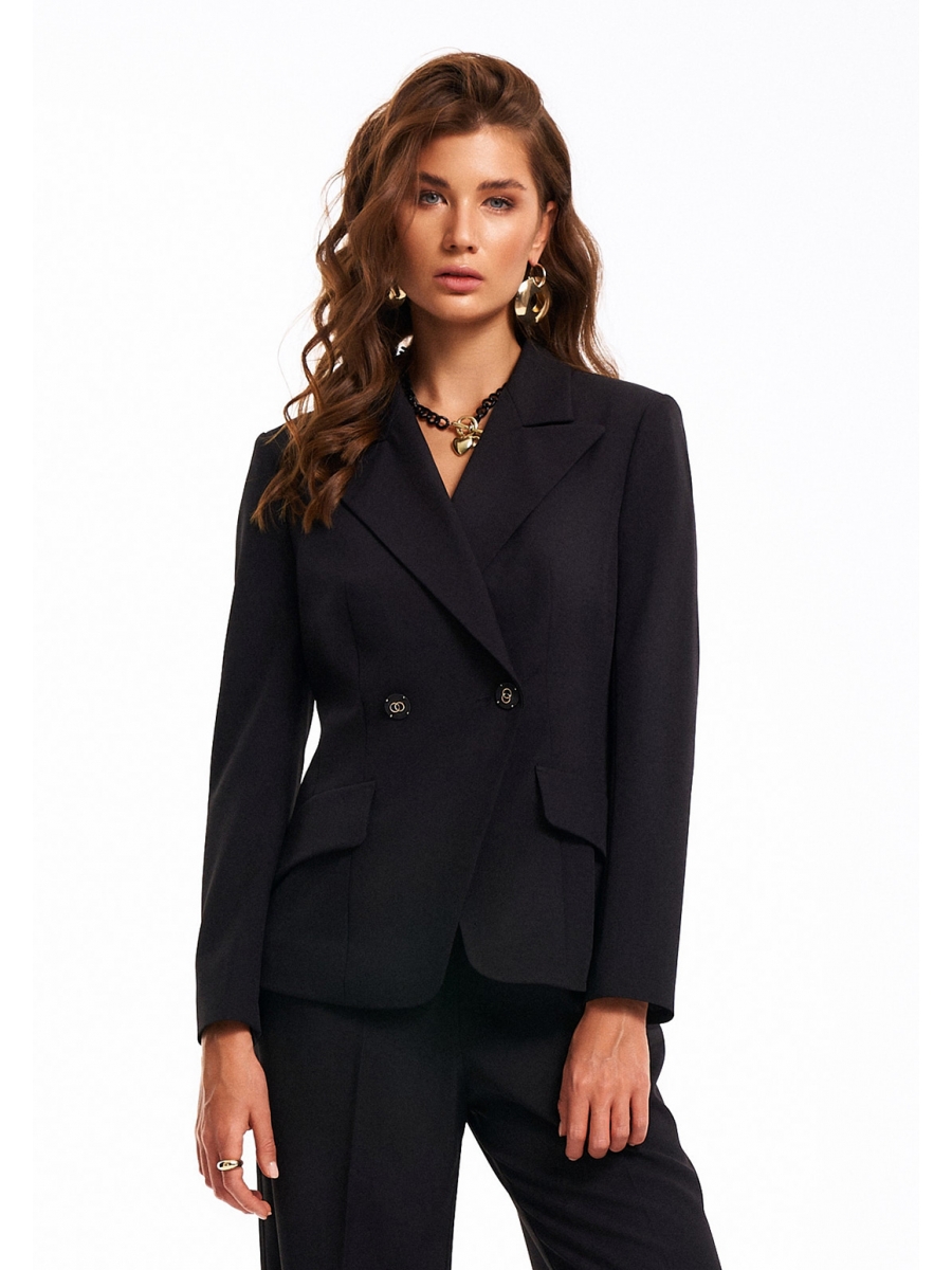 Двубортный жакет приталенного силуэта с клапанами по переду и дизайнерским элементом по спинке в виде небольшой прорези на уровне талии и застёжки на пуговицу.