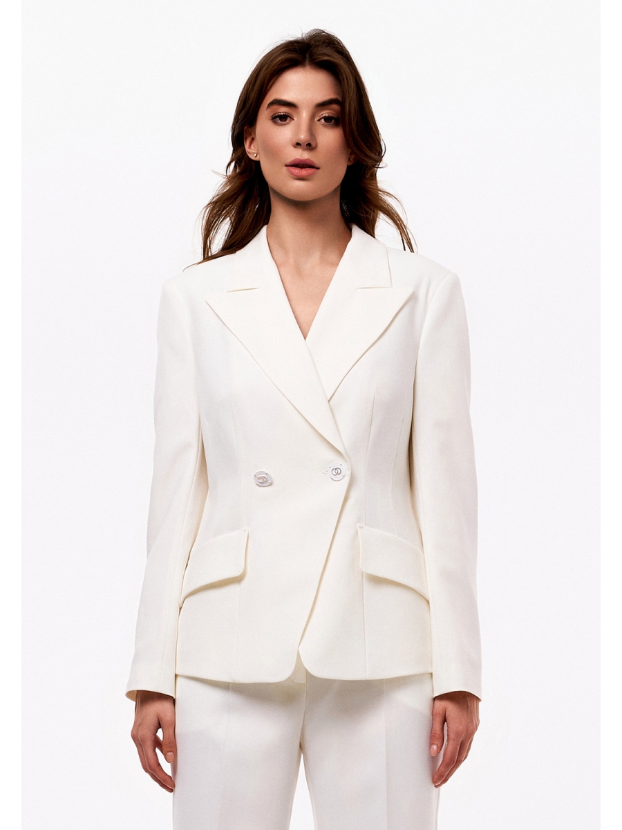 Двубортный жакет приталенного силуэта с клапанами по переду и дизайнерским элементом по спинке в виде небольшой прорези на уровне талии и застёжки на пуговицу.