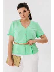 Особенностью модели является притачная баска со встречными складками, придающая образу утонченность и женственность. V-образный вырез горловины добавляет нотку изысканности, а центральная застежка на пуговицы обеспечивает удобство и стиль. Жакет оснащен втачным коротким рукавом. Спинка украшена рельефами и имеет средний шов, что создает гармоничный силуэт.