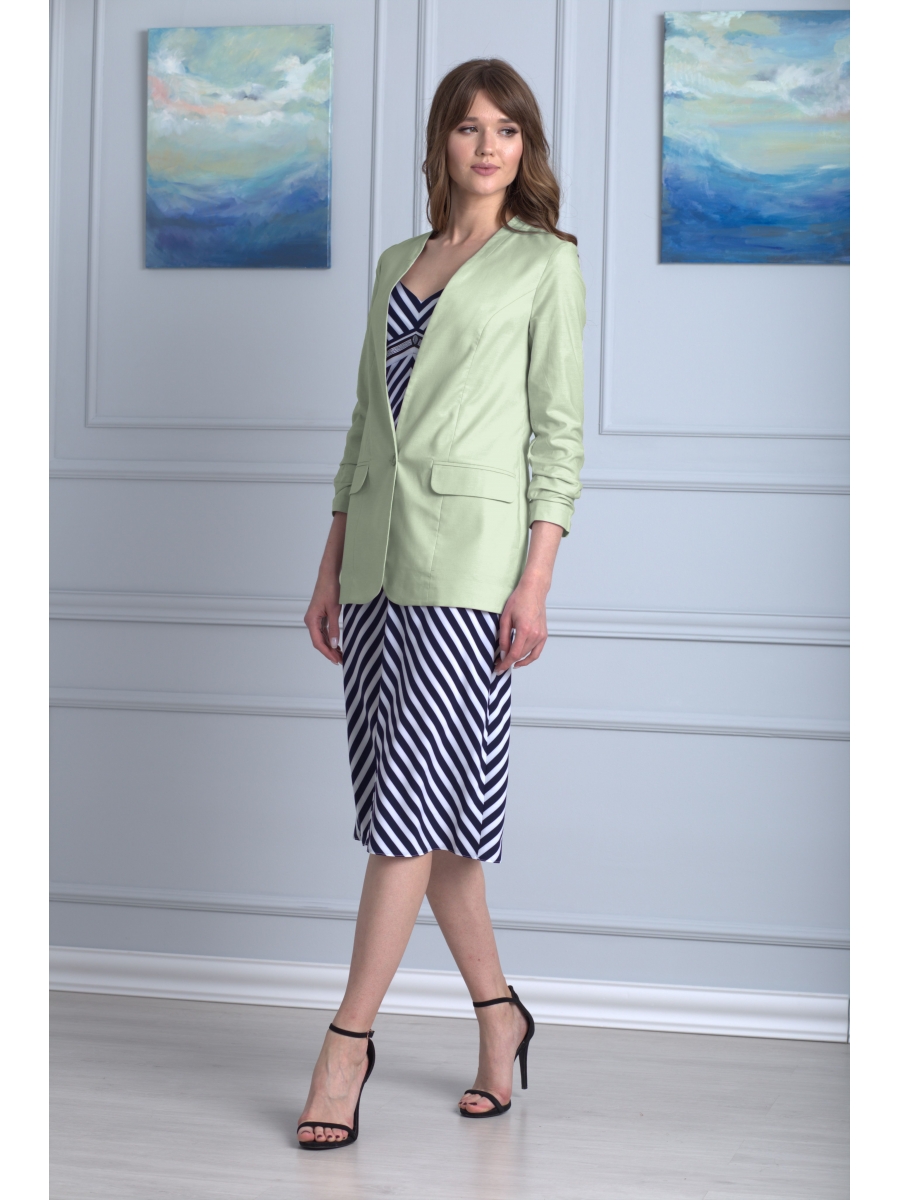 Однобортный с застежкой на одну пуговицу, двухшовные рукавами со складками по низу.Жакет